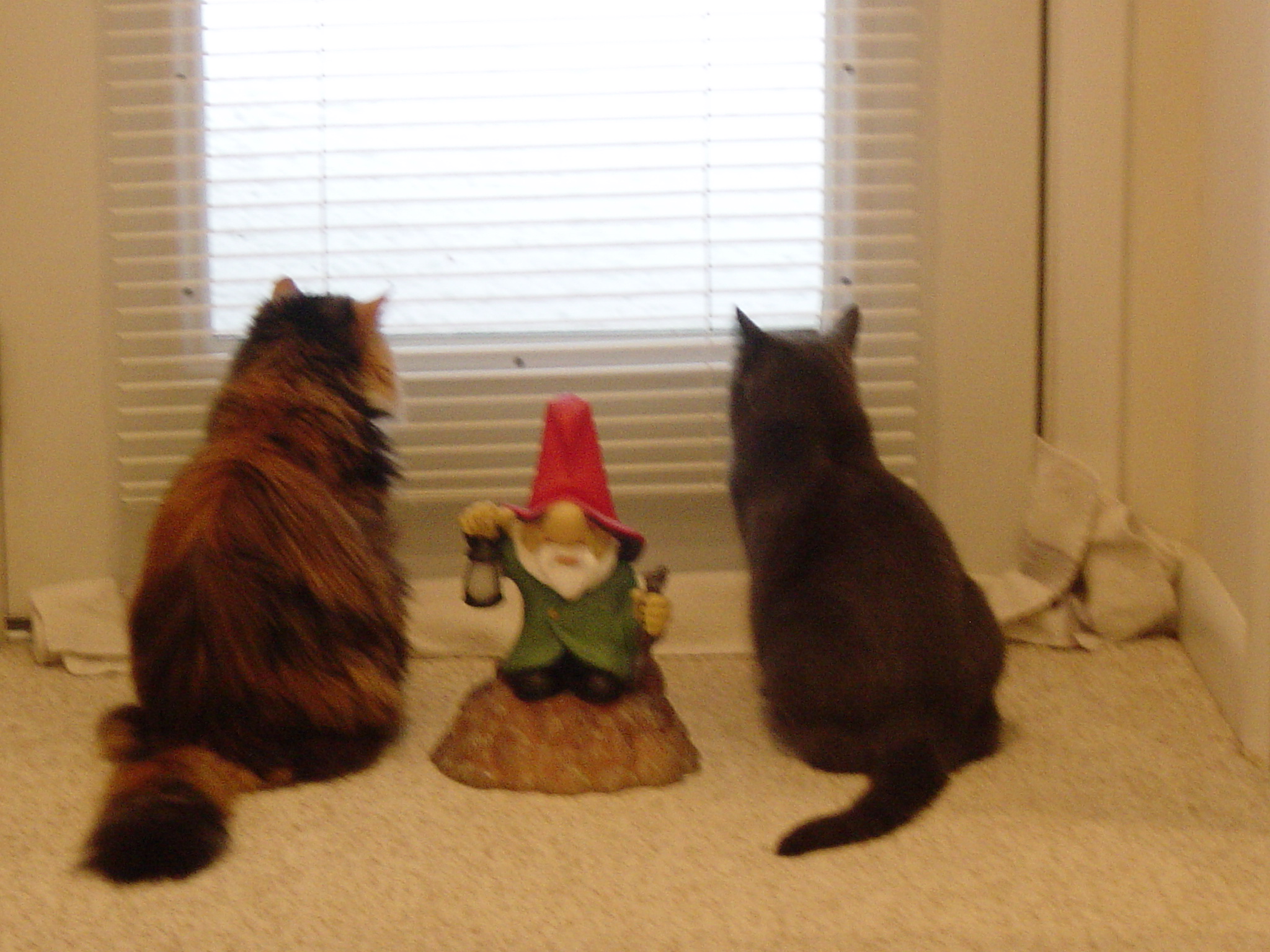 and who can forget cats of the past, like Gertrude (calico) and Cuddles (Russian Blue) looking out the backdoor with their friendly Gnome…..