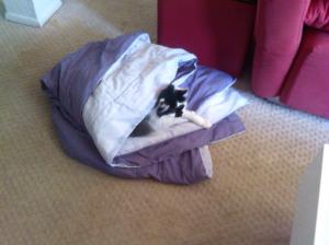 Sofie can be pretty funny. Especially when you yell at her, she drops down and rolls on her back and tries to look cute. The other day C found her asleep outside her kennel but under the door curtain. Now that looks really funny, though I do not think she knew it. Unlike Sqaush, right now we are laughing more AT her, not necessarily WITH her.
