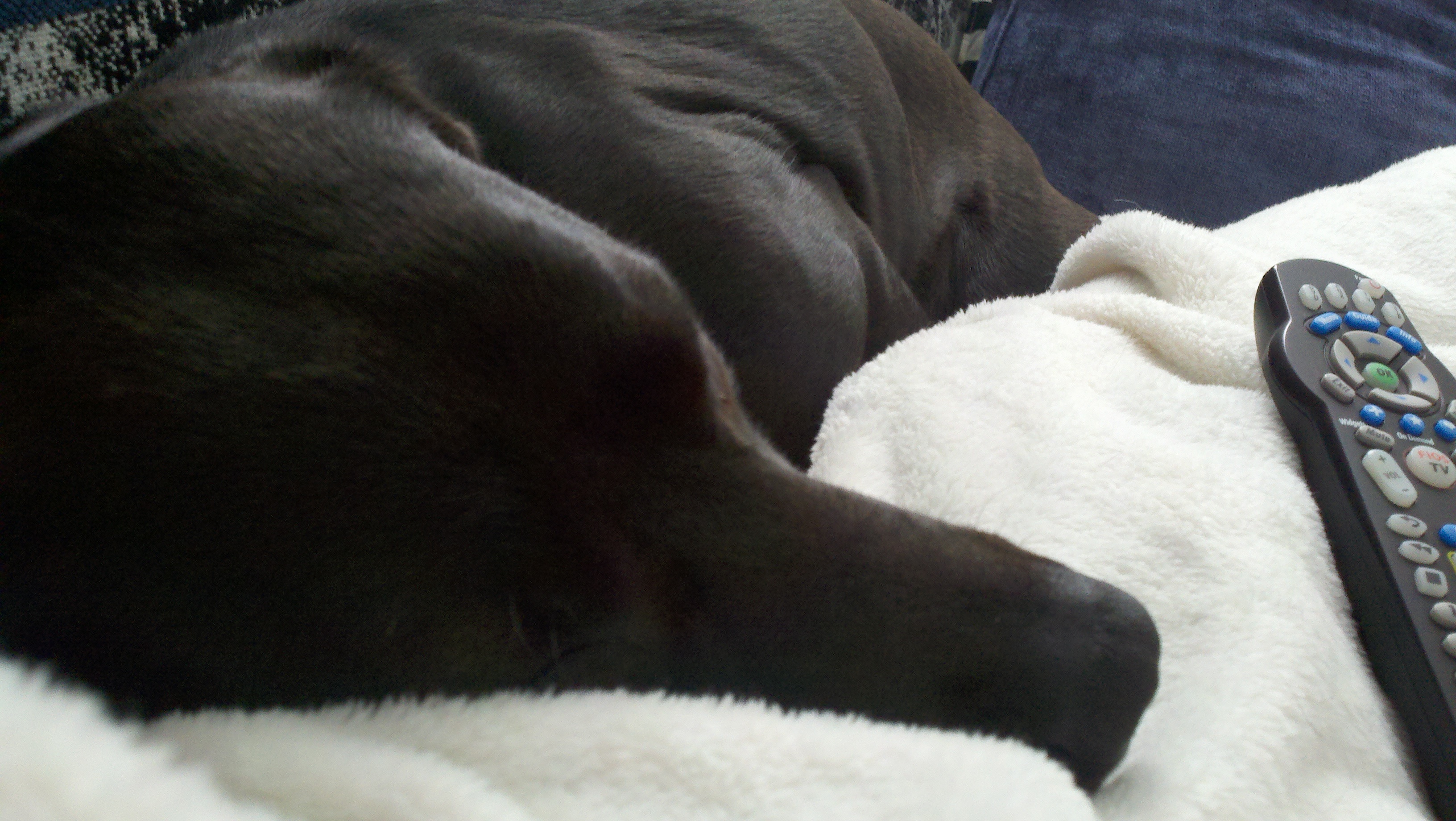 It is no fun when one of your animals does not feel well.  Louise has an ear infection.  I have been cleaning her ears 2X a day with this stuff that the Vet gave use and then putting in these medicine drops.  She does not like the medicine very much but she is a good girl and will let me do what I have to.  But this afternoon she got really smelly after we came in from our walk.  I thought it was Sofie, because, as usual, she was rolling in every patch of ivy or weeds that she could find along the way.  I gave Sofie a dry shampoo treatment, but the smell persisted.  Then later my daughter said, :”Owww, get Louise out of here she smells!”  I was thinking it was her ears but it was more a stomach thing.  Well tonight she could not contain herself and got sick all over the living room.  Now all I can think of is that the ear drops are to strong and they have given her the runs.  I hate when any of my babies are sick.  I will call the Vet in the morning, but she is resting comfortably now.  As you can see from the picture, she likes to control the TV remote when she does not feel well too.  Next she will want some chicken soup.  Just another dogdaz at the zoo ❤