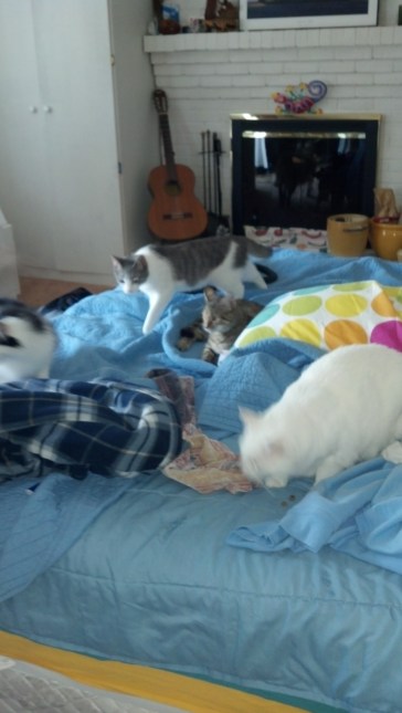 A pride of cats threw the humans out of the bed!