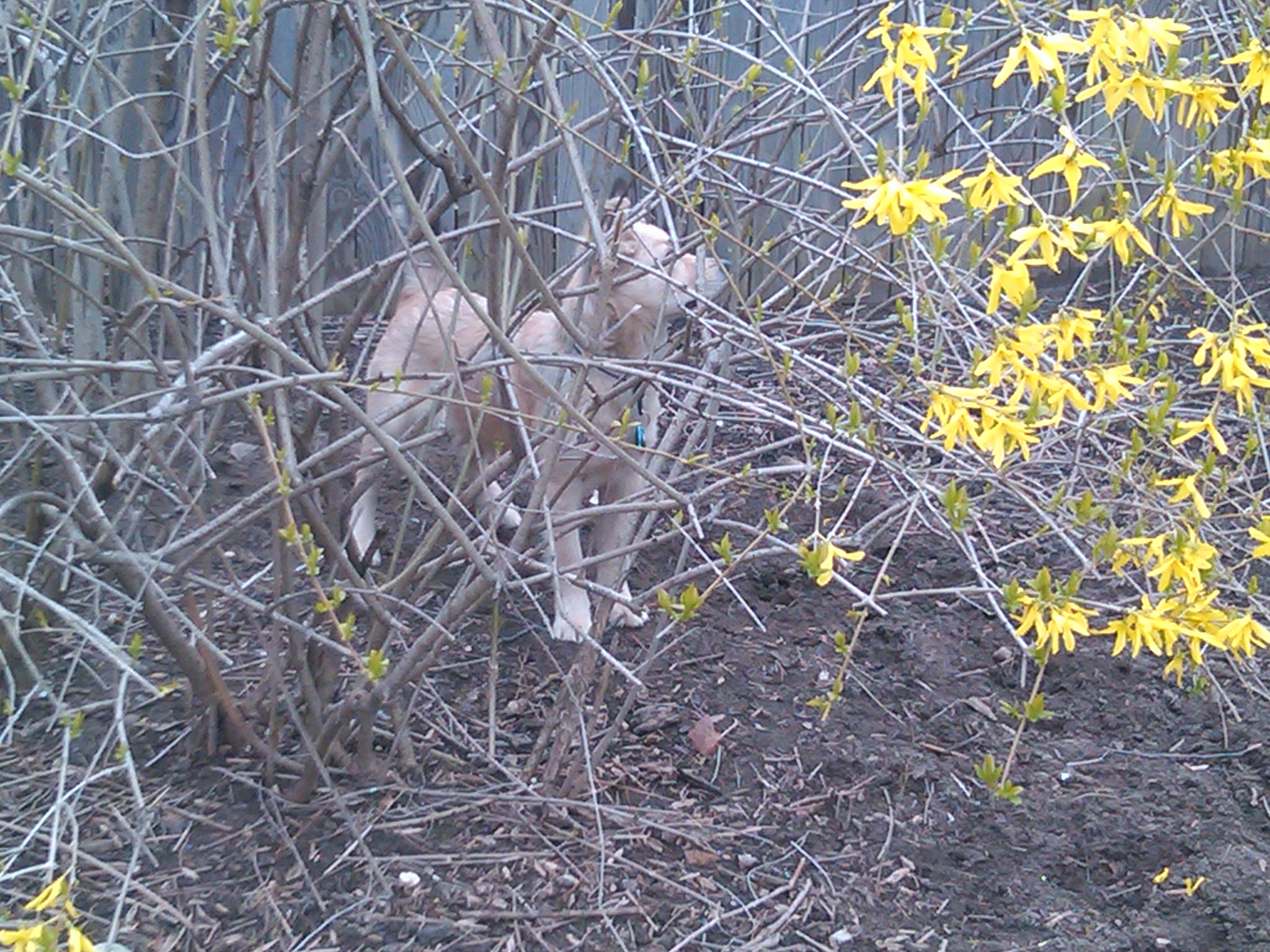 The forsythia offer a perfect hideout for dogs who think they can not be seen. Sofie is silly because she loves to play behind all the bushes and hide from Louise. She always wonders how Lulu finds her. Just another dogsdaz morning at the zoo ❤
