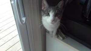 Nine has decided that since the dogs get to go in the back yard out the sliding door, he should be able to follow. So he hides behind the TV that is next to the slider and waits for the moment when someone opens the door and maybe does not see him escape. When he gets caught trying to sneak out he gives me that “Who me?” look. You know the one; when your animal has done something but they think the stupid human would never catch on to the game that they are trying to play on you. “I’m so cute, I would never try something like that Mom.” Poor Nine, life is just so hard when you have to follow the rules.