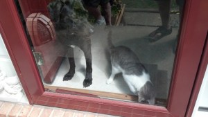 I can not seem to get out the door these days without my 3rd dog, Nine the kitten, trying to come along.  I know that I told you in the past that I do not allow any of the cats outside. That is just the way it is.  But it seems that I am going to have to get him a harness and walk him along with Louise and Sofie because he is just not taking ‘No’ for an answer.  The trouble with that is we usually walk in the morning with Lulu’s boyfriend, Mojo, and he would eat Nine in one bite.  One day Mo saw the cats through the glass and almost broke down my door.  Not sure I want to test that out.