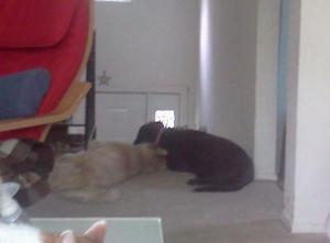 It is the same in my house. 🙂 They wait at the top of the stairs at certain times of day. LOL Oh and Delilah always goes first down the stairs. 🙂