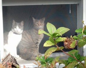 Its very rare that we have windows open these days because the temperature has dropped, so it is a real treat when the day is warm enough and the kitties get to feel the breeze and lie in the sunshine.  This was such a day and Nine and Stella were taking full advantage of the moment.  This fall has actually been pretty cold (V says I say that every year).  We like to have fresh air in the house as long as possible, especially with all the animals indoors, so we open windows whenever we can.  There is nothing as nice as an open window, if you are a house cat.  >^..^<