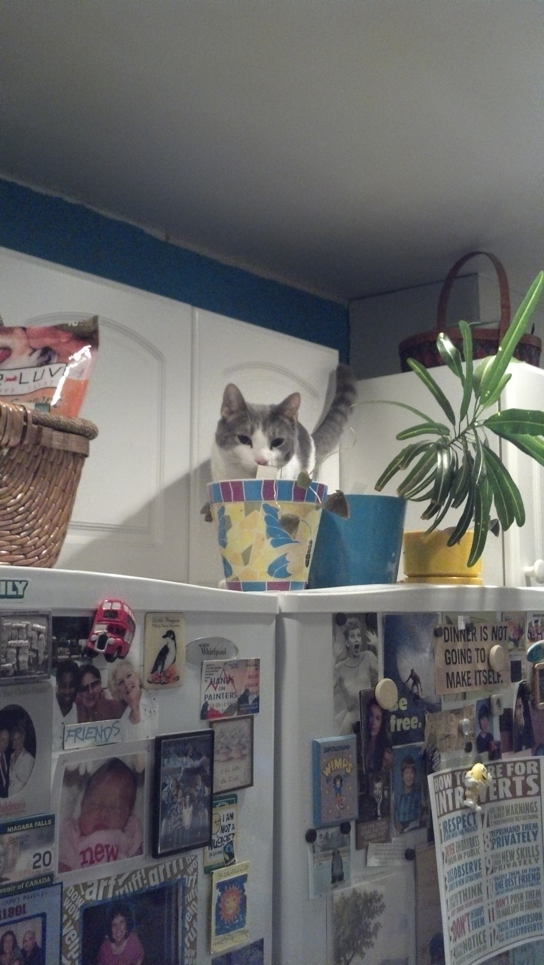 Hey Cat Friends, Mom has newspaper crumbled in the bottom of the big plants so that we don’t do the dirt thing anymore. And she sprays the leaves on the trillions of plants in the house with something bitter, I think she calls it ‘Apple Bitter.’ She did not think I would get to the one’s on the Frig. Hahahahaha – Nine