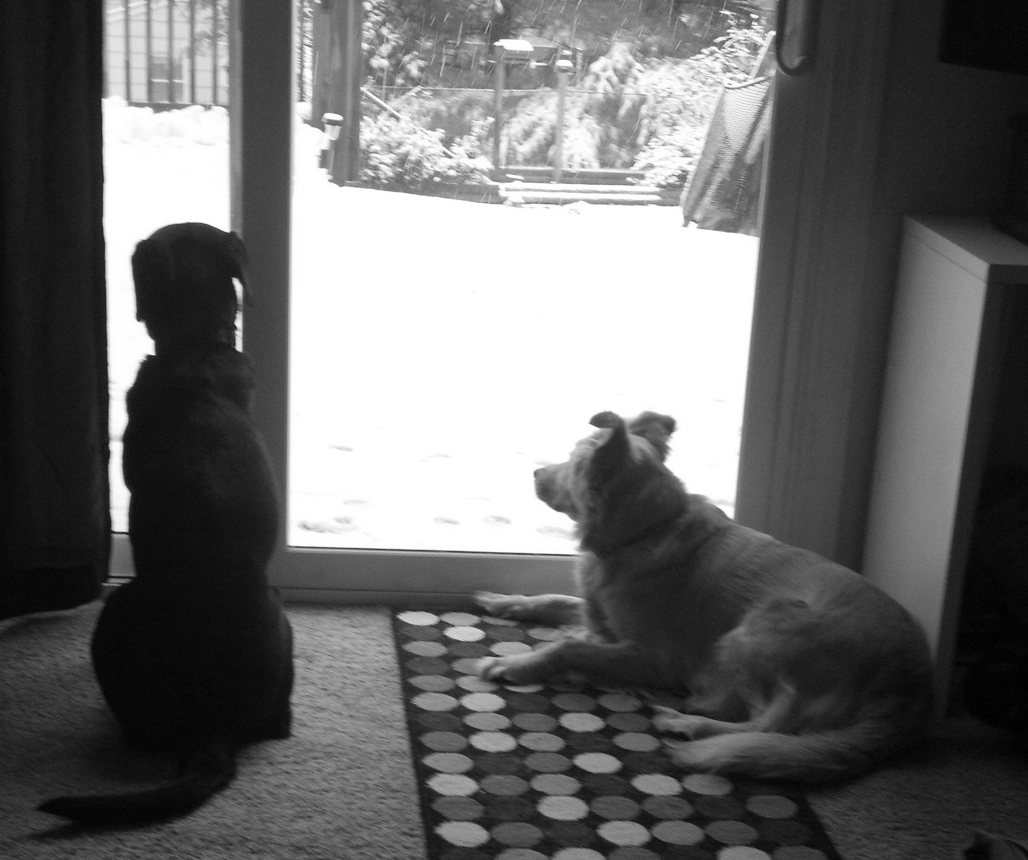 It looks cold out there, we would be inside watching the snow fall too like you are. Nice black and white picture. Hugs and nose kisses