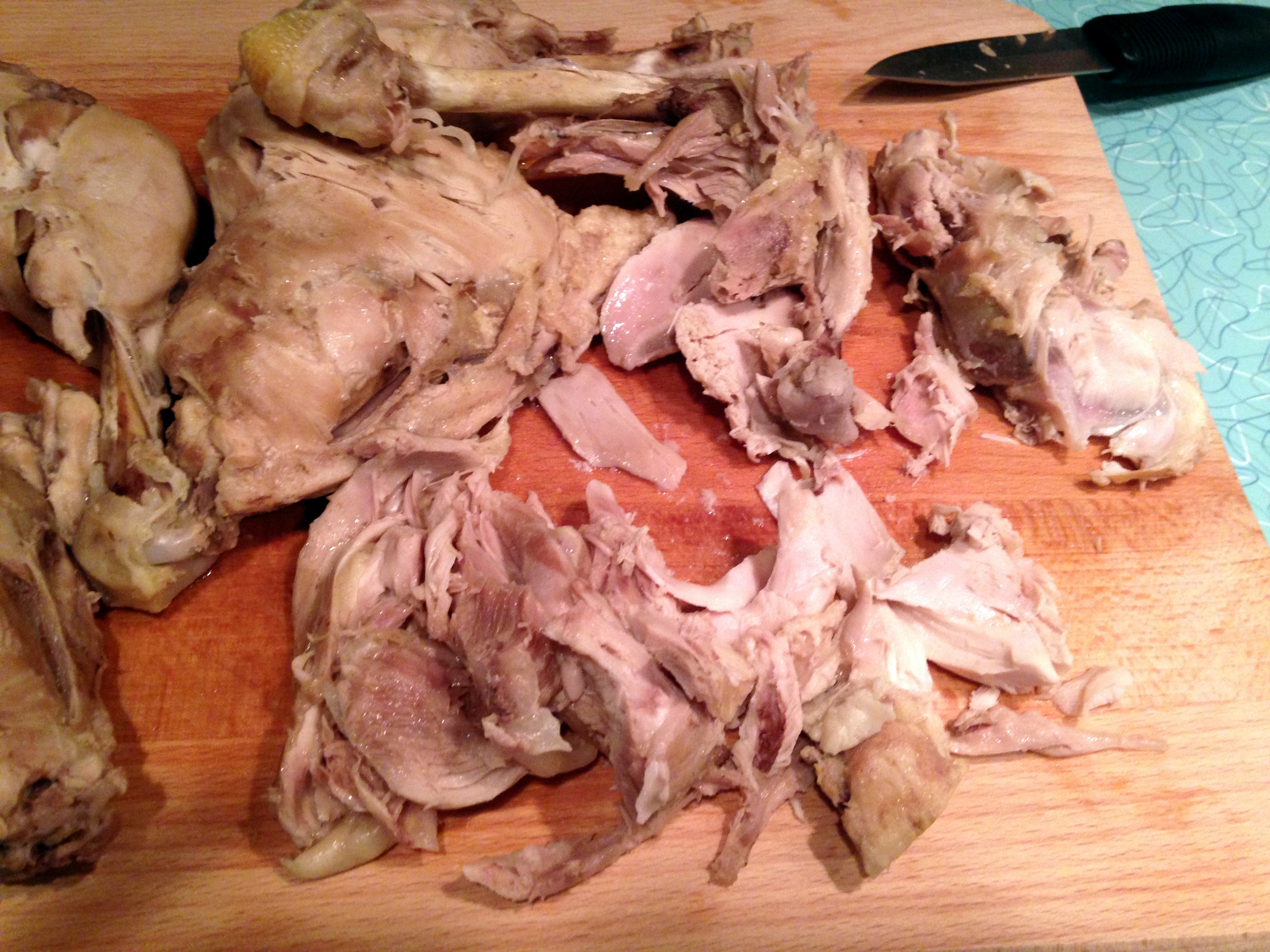 – When cooled, debone the chicken into small chunks and get rid of any still remaining skin or fat. (Think LEAN.)