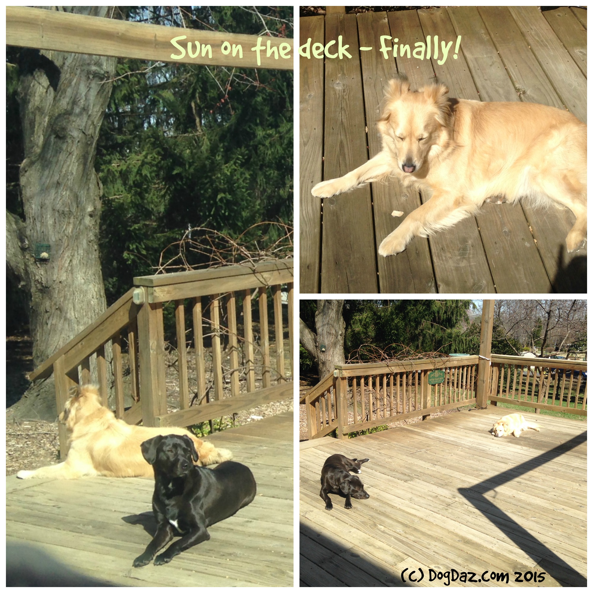 It feels great to lie out in the back in the spring sun. The big tree is starting to bloom. Mom lets us stay out for a little while now that it is warming up and not raining or snowing all the time. We can’t stay out too long because we start to excavate the yard if no one is with us. I think that is very helpful for the gardening that they are going to start very soon, but V gets mad and calls us a nuisance. And Mom doesn’t like to have to always wash us down because we are full of brown stuff (I think it is called MUD). I just love to get toasty warm. Happy spring – finally! – Louise (aka Lulu Belle)