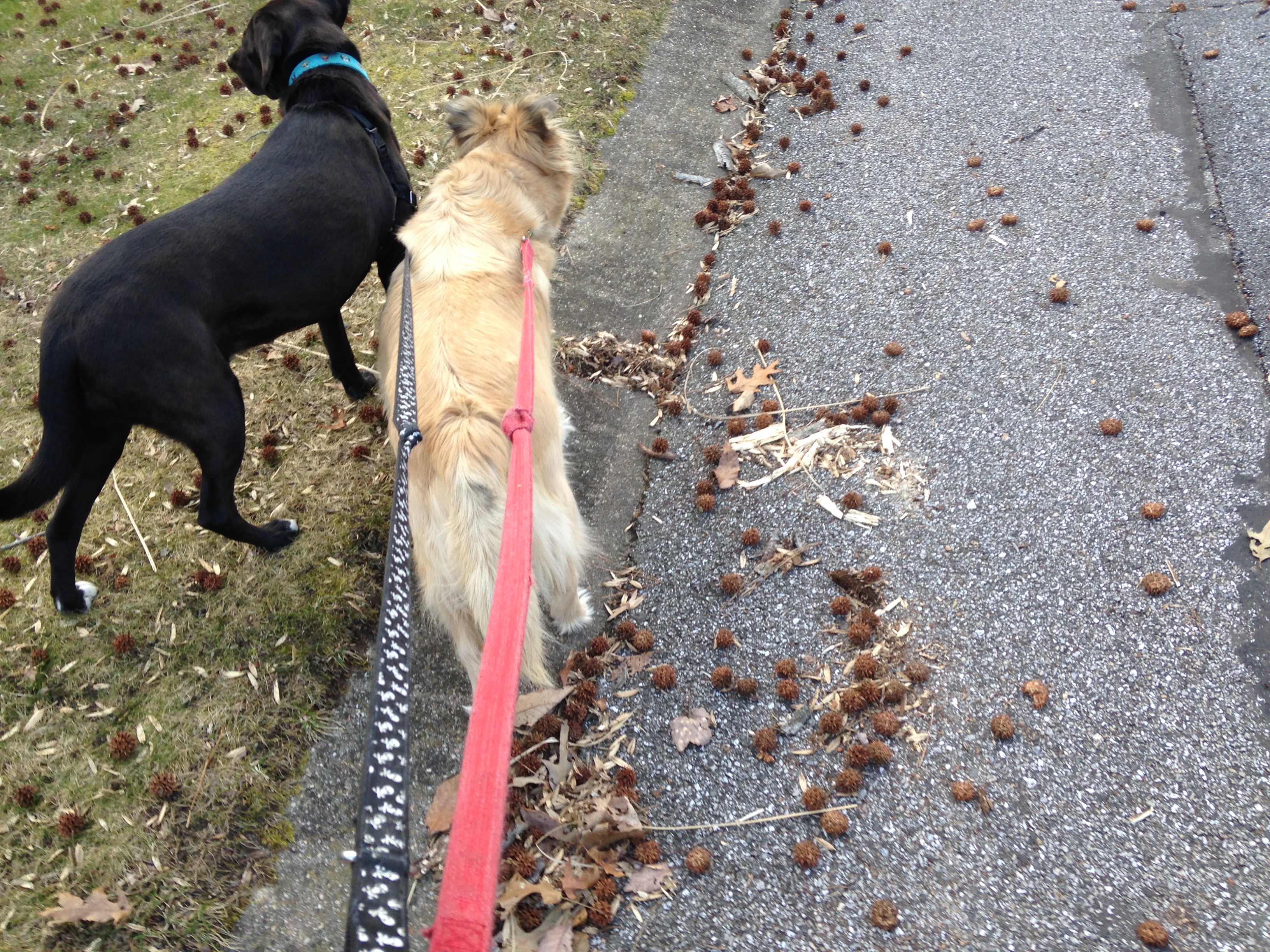 Everywhere, and I mean everywhere you walk or look are these icky brown balls. The dogs jump when they step on them and Mom has fallen flat on the ground by stepping on one.