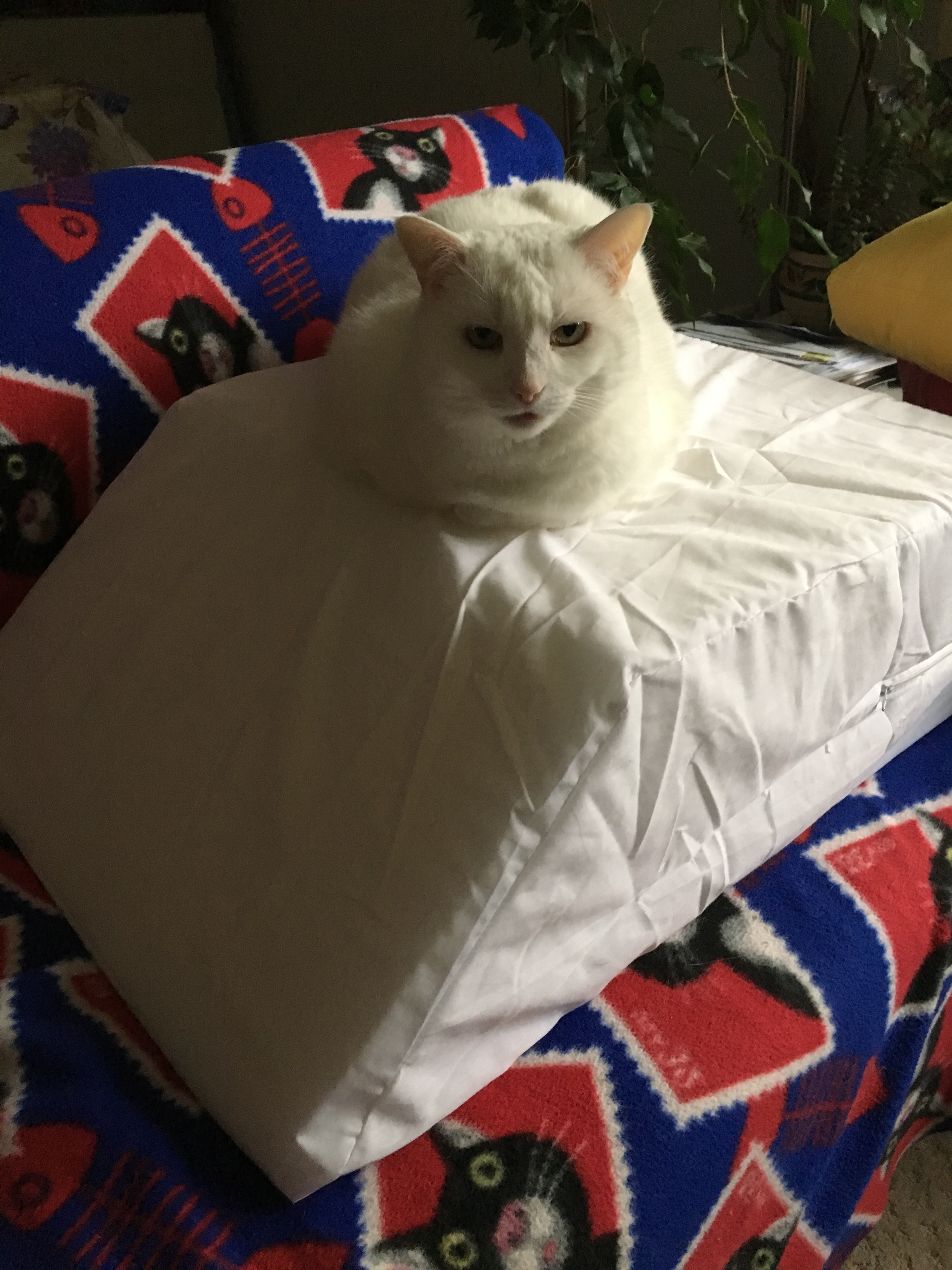 Mommy is having foot surgery next week and won’t be able to walk for awhile. She got this new leg wedge pillow to keep her foot above her heart. I have decided that it is my new favorite place to sit. It is mine and I like it! I guess Mommy will have to cancel her surgery because she will have nowhere to put her giant booted foot. Oh well, the dogs will be happy. She won’t be able to walk them for 2 months, which means, lots of cat cuddle time with me! I like that idea too!