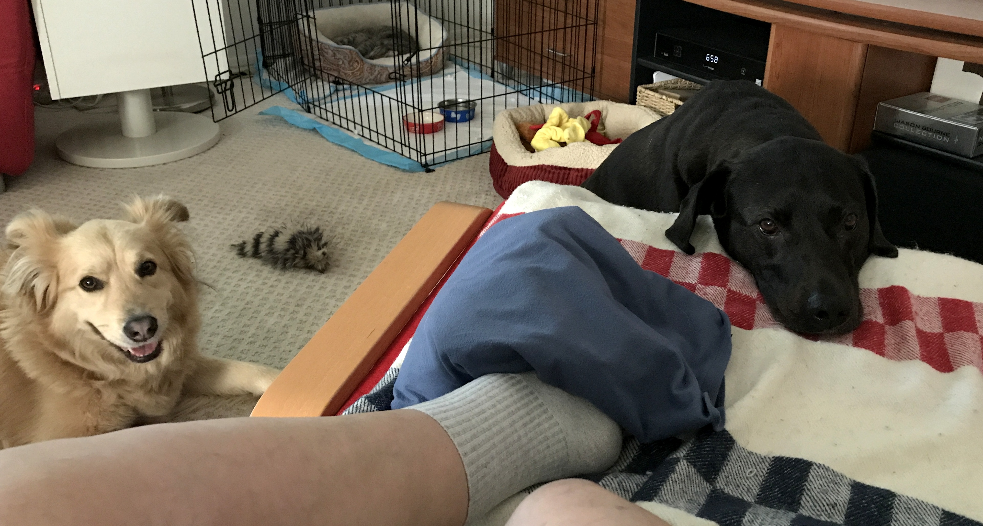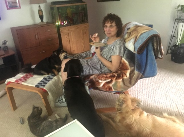 The 3 dogs and the cat-dog all want my lunch. It is kind of hard to ignore all the salivating stares when you are trying to have a bite to eat. They always have been beggers, but now that I have limited mobility, they all seem to push me around a lot more. They aren’t getting the exercise that they are used to, and just like me, all they want to do is eat right now it seems.