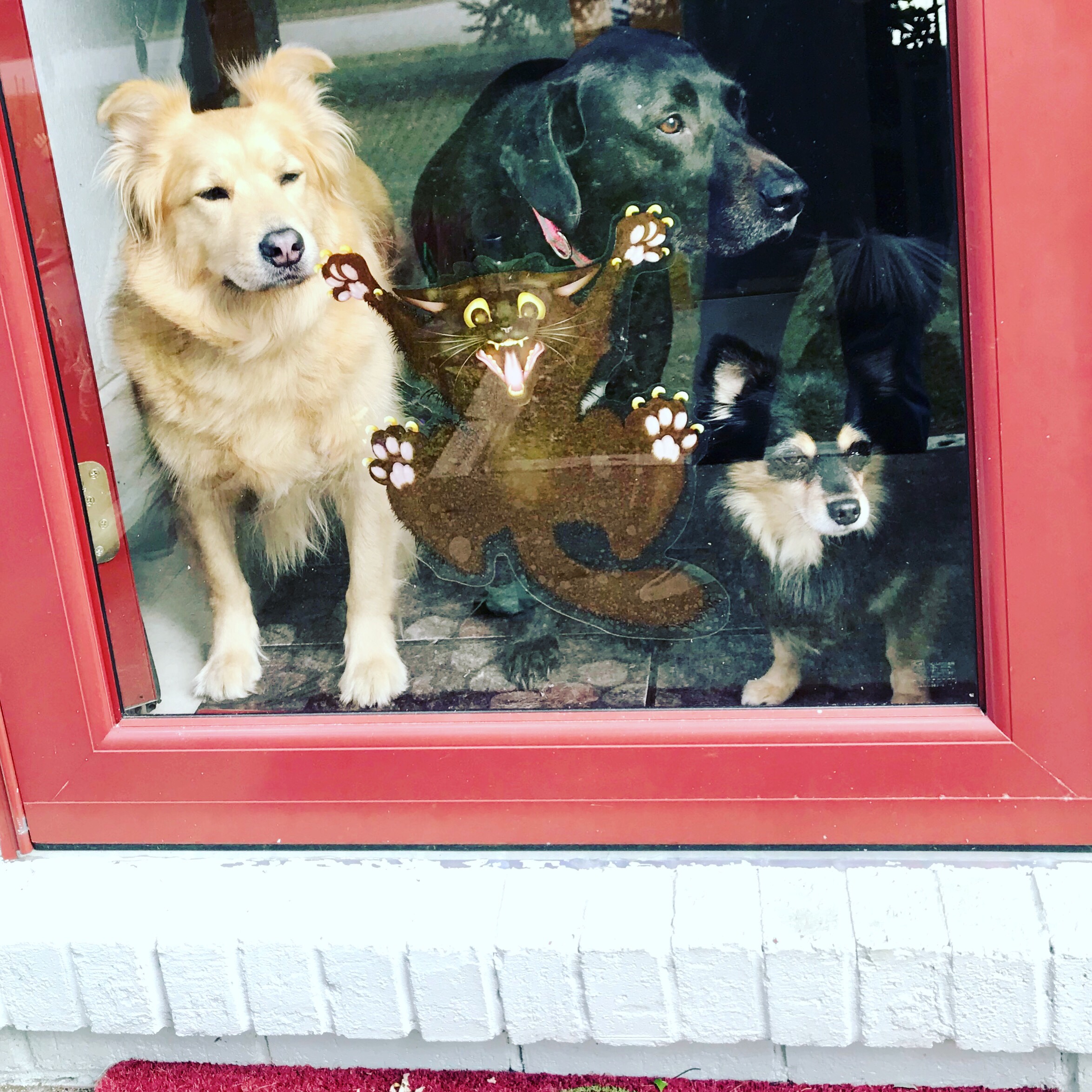Love the screaming cat on the glass, trying to get away from your canine trio.