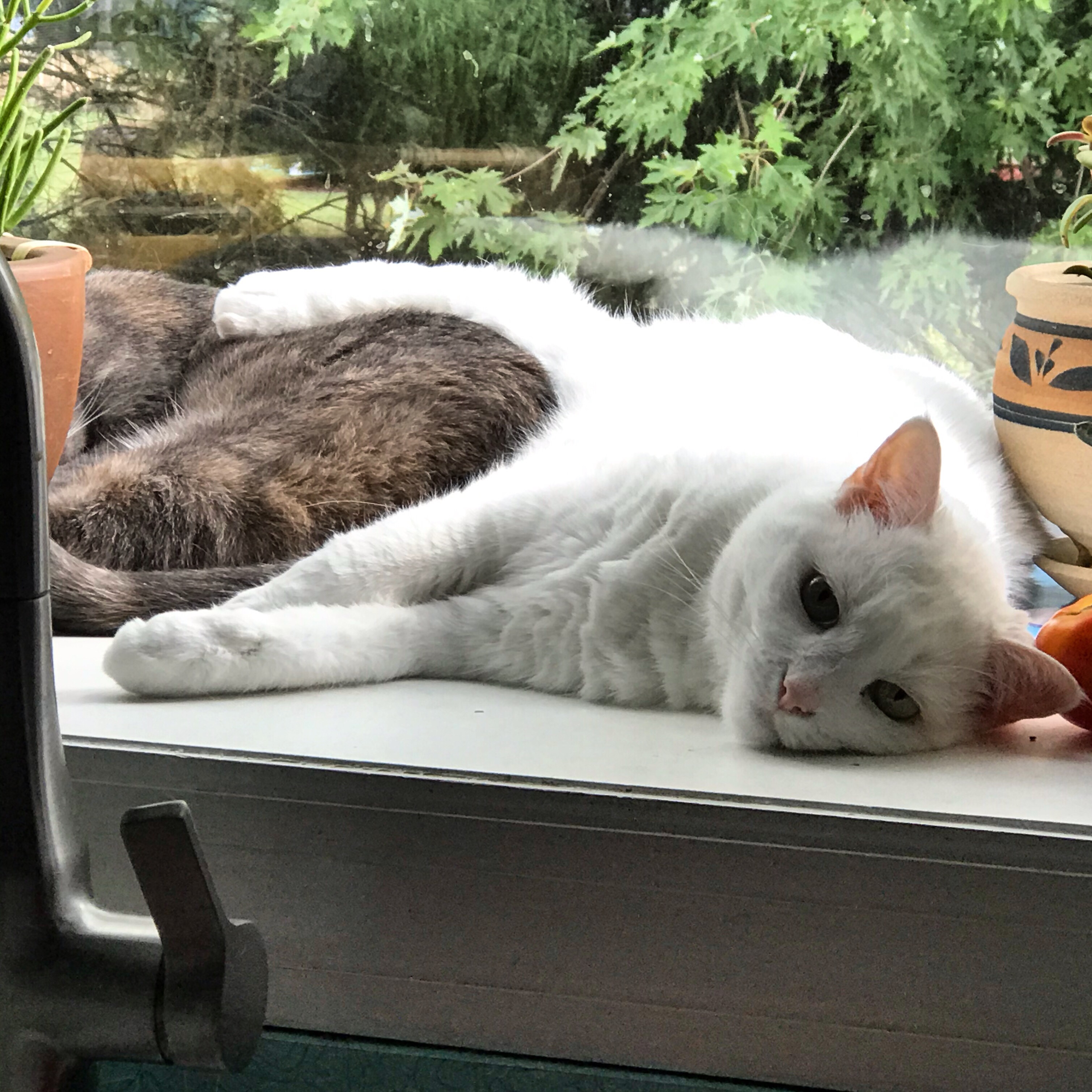 The herb window is Noel’s domain. But you know Mini Cooper. She will go anywhere she wants and pushes herself on cats, dogs, humans. She is a ‘very present’ cat. I am not sure that Noel is happy about sharing her afternoon nap with Mini, but she is making the best of it. Her face kind of says ‘Help me please, get this youngster out of here!’