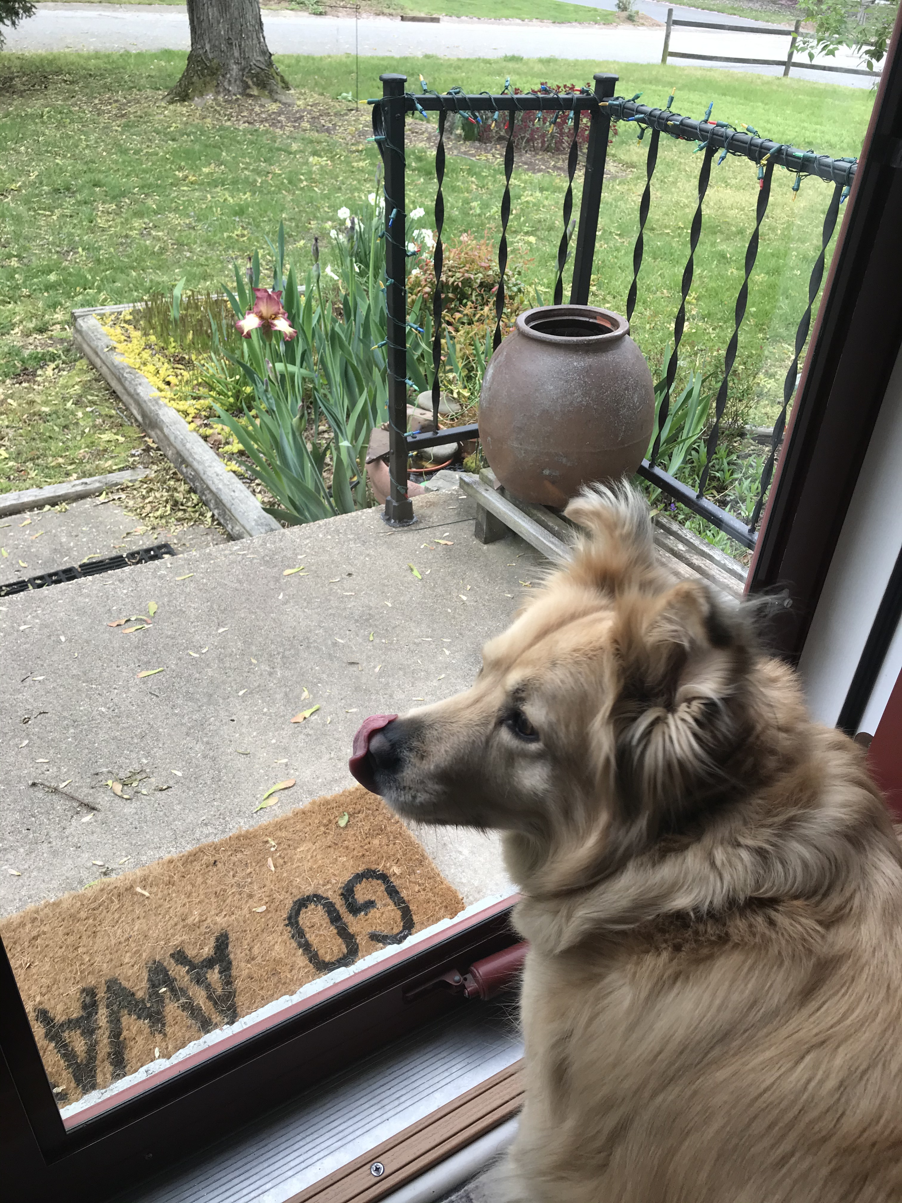 Sofie yesterday (April 2020) enjoying the first iris of spring