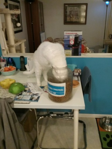 Hahaha. Love the picture when she is almost all the way in the container. They can get into things quickly, for sure.