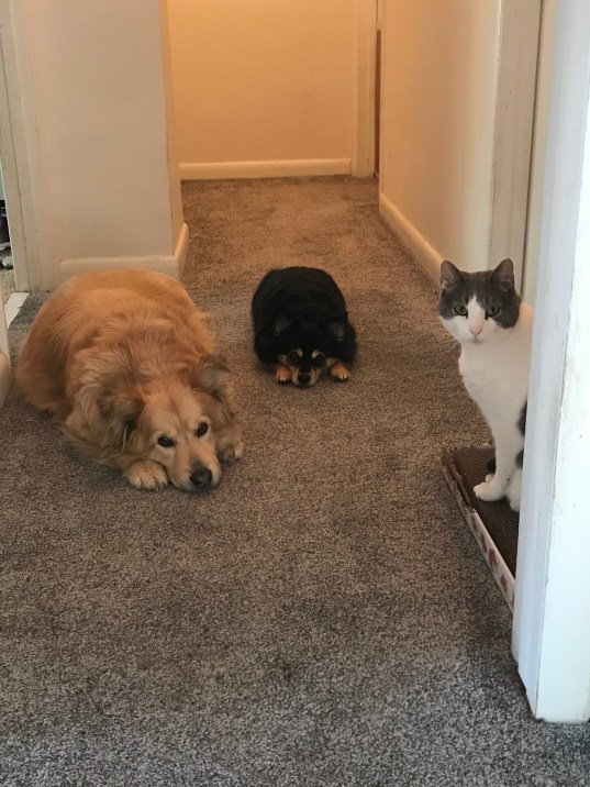 Animals can be so funny, don’t you think? Charlie was waiting for V, who is in the bathroom which is the door to the right. So, Sofie and Nine decided to join him and wait too. I could not resist taking the shot. You would think that these goofballs actually like each other. What is it about a closed-door that makes animals want to knock it down?