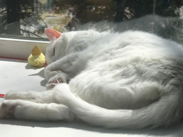 Noel’s favorite toys are these little yellow chicks. They live in the herb window (where she spends most of her time). After breakfast, which she of course eats in the herb window, I usually go into my office down the hall from the kitchen, to start my day. In about 10 or 15 minutes I will hear her calling me, insistently – “Come now, you must see this, come come come.” She usually carries one of the chicks, as if it was a mouse prize, from the herb window to somewhere else on the kitchen counter or the kitchen table. She wants me to come and see her prize. Seriously, this goes on almost every morning. Then I pick up her chick, pat her on the head, tell her what a wonderful mouser she is, and throw it back in the herb window.