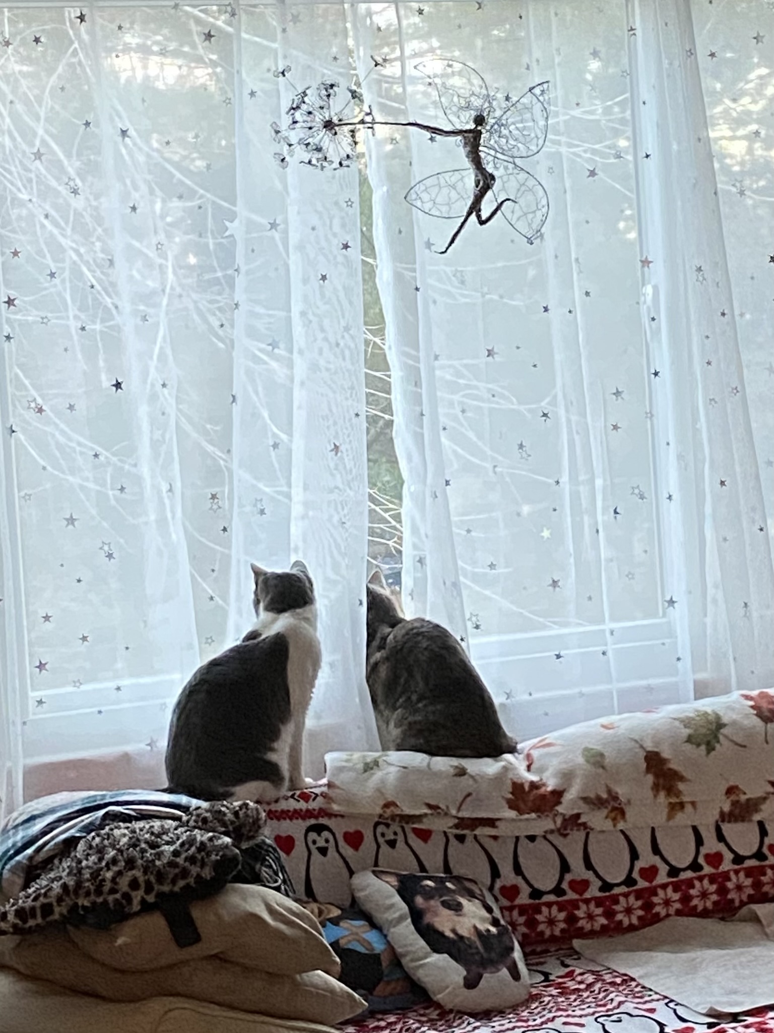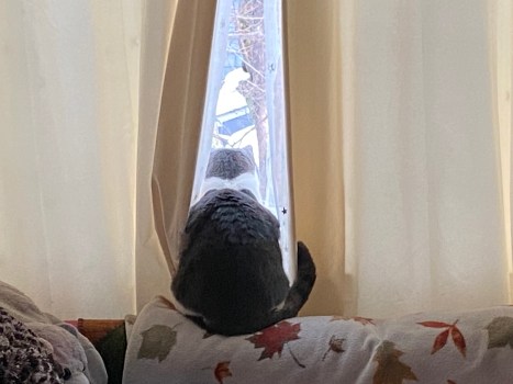 The cats, at least Nine and Mini, have been moving the curtains and spending a great deal of time, looking out the back window.