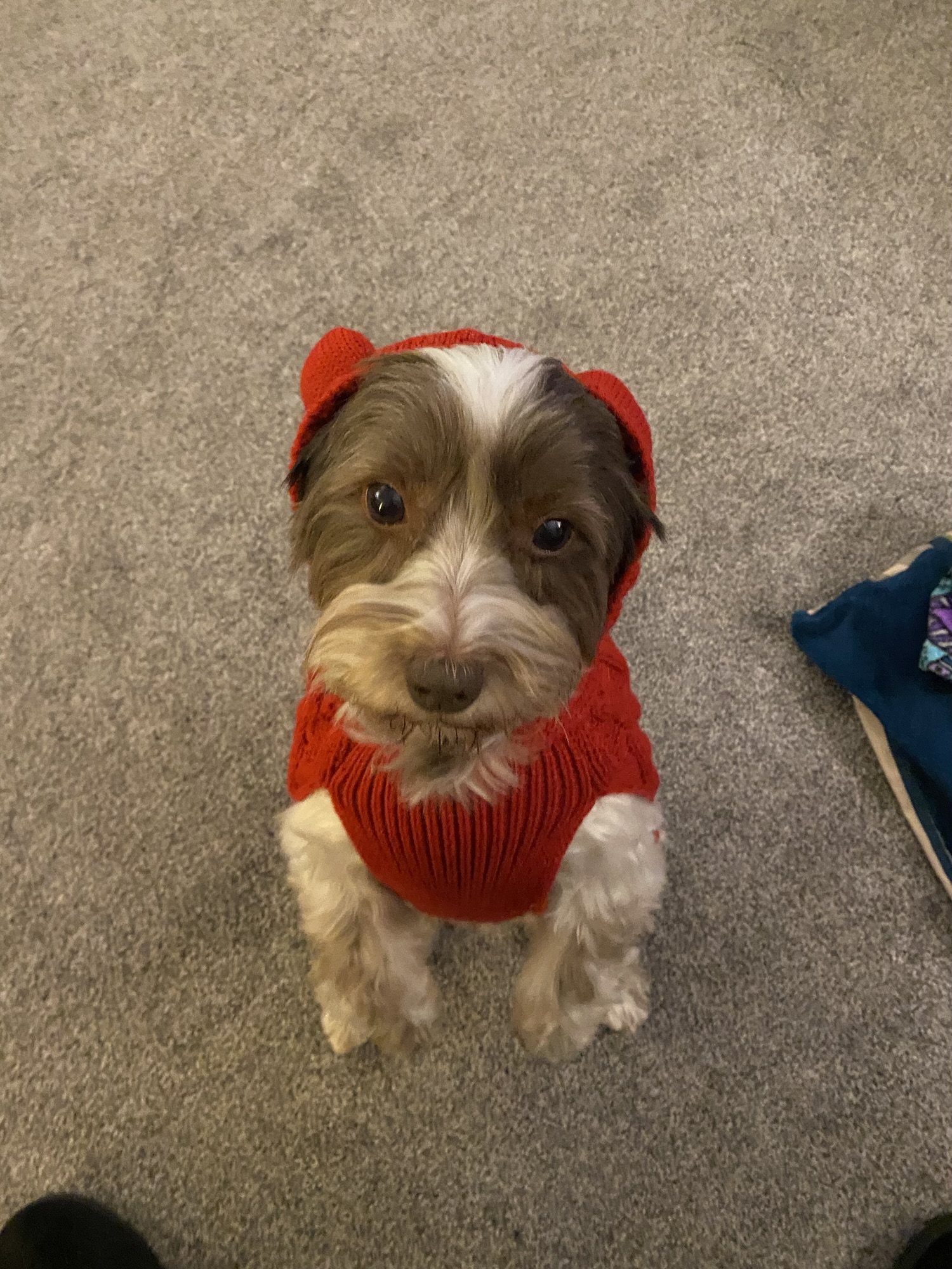 I like my sweaters. You see I have fine Shih Tsu hair, not tons of fur like the butterfly, Papillion, Bearnard. Mom makes me wear a sweater anytime the temperature outside drops below 45 degrees. But I don’t mind. Aren’t I the cutest? Mommy says that I look like someone called “Dobby” when I wear this one with ears.