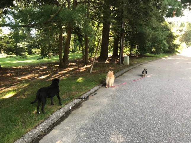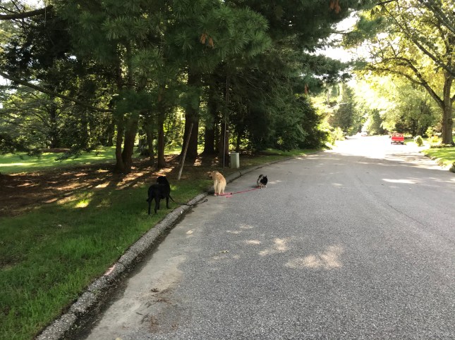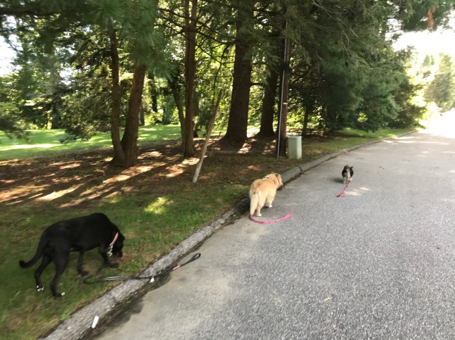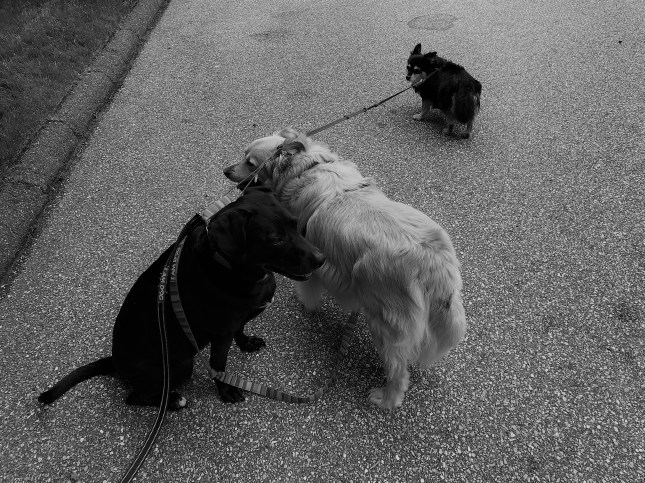 I thread Charles’ leash on Sofie’s and Sofie’s leash on Louise; Lulu being the heaviest and the most responsible of the three.