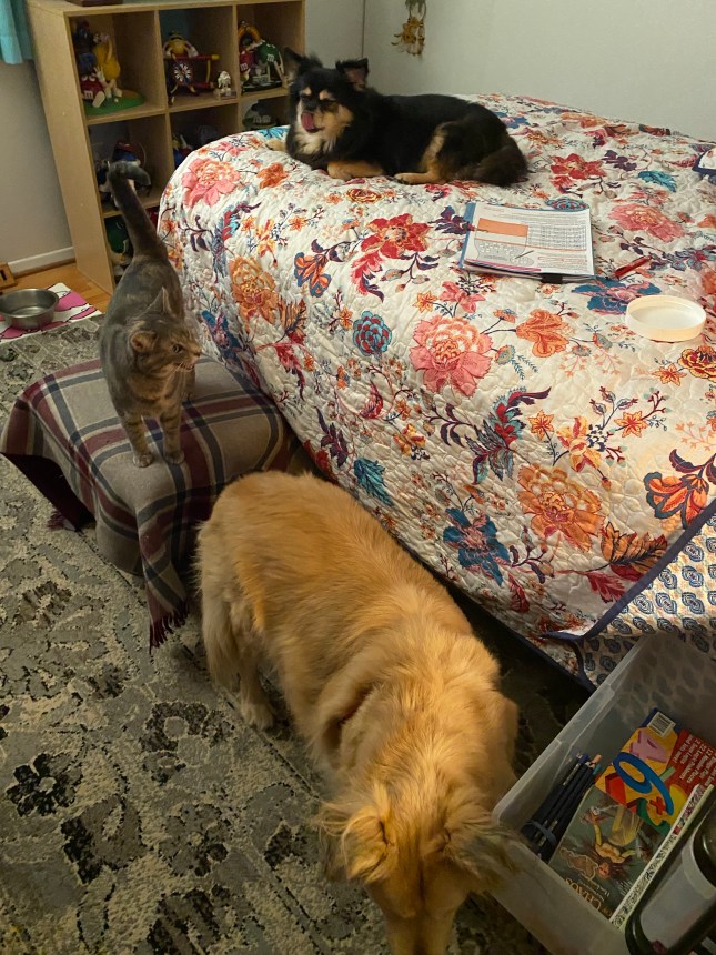 Mom had the carpet cleaned. Oh my what a disruption that was! She had to pick up all our toys and the beds. And the carpet was moist for a few days so she didn’t want to put the beds back. Put Nine was not happy about that so he laid down where the dog bed usually is. That confused Louise. She was not sure what to do. So Mom laid a sheet on the floor and she liked that. But then Mom put the big bed back and Nine took it until Sofie chased him away. Finally, the beds are back and life is back to normal. If you call a cat sleeping in the dog bed normal, well it is around here.