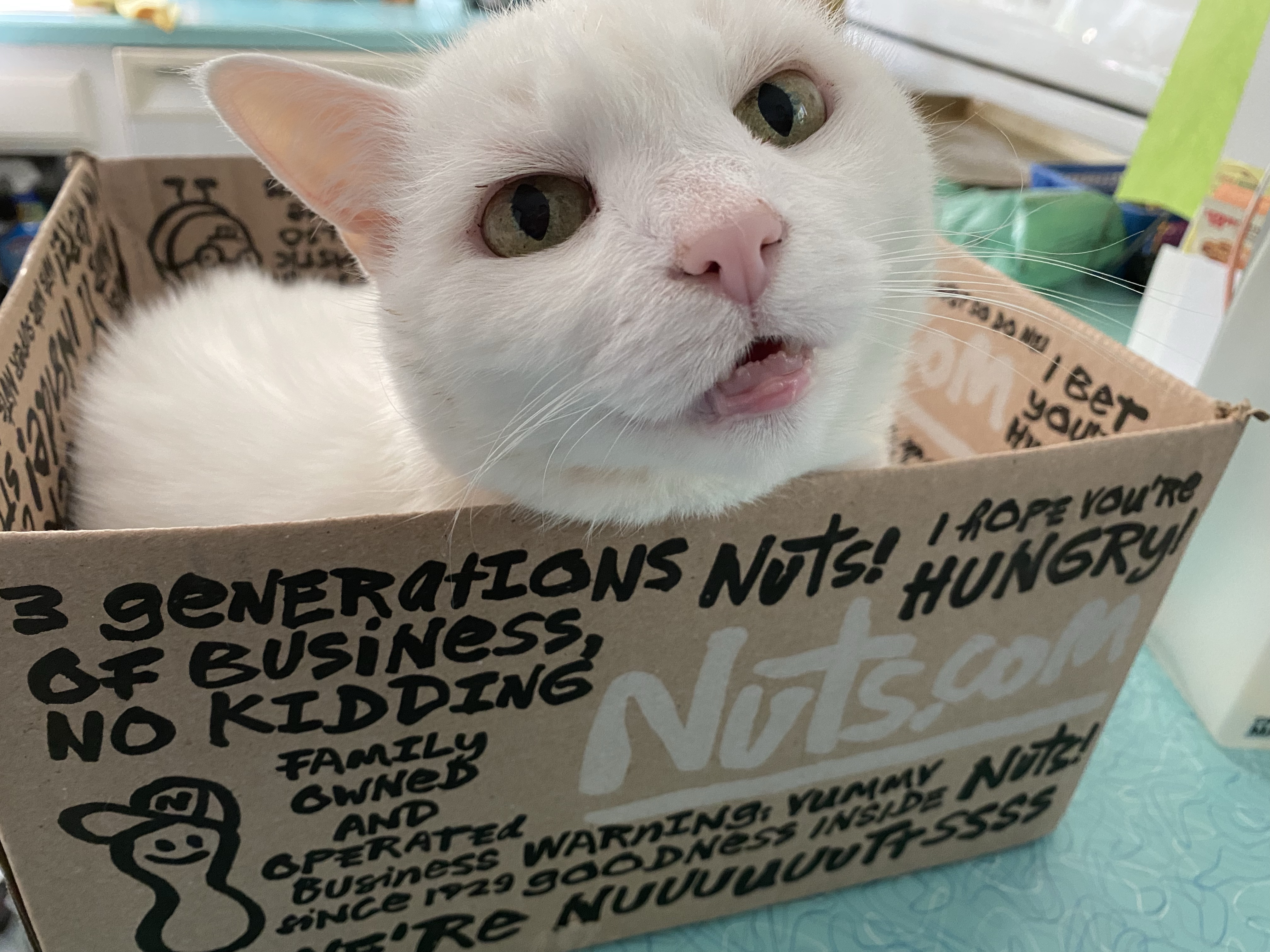 Luckily, she didn’t come crashing down and bring the fan and all the boxes with her.