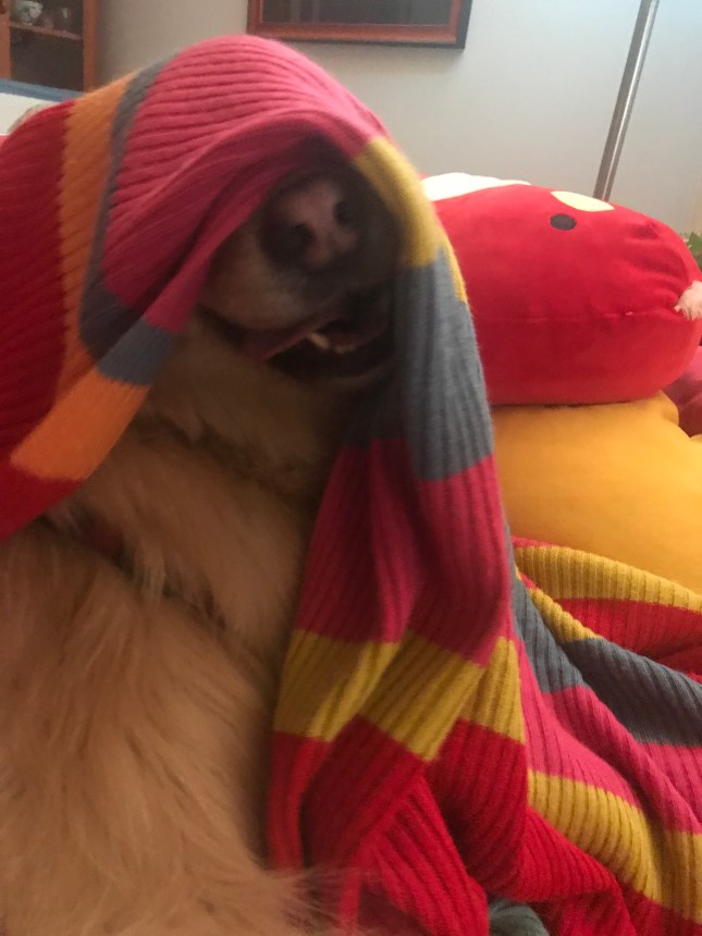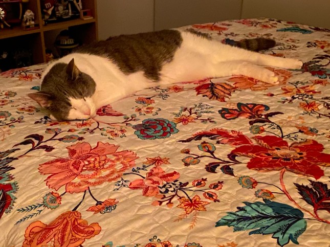 This is one of my favorite shots of the animals mirroring. Here is little Mini Cooper with Louise laying together on the bed under the blanket (I did the blanket thing, they didn’t). Humans mirror too.