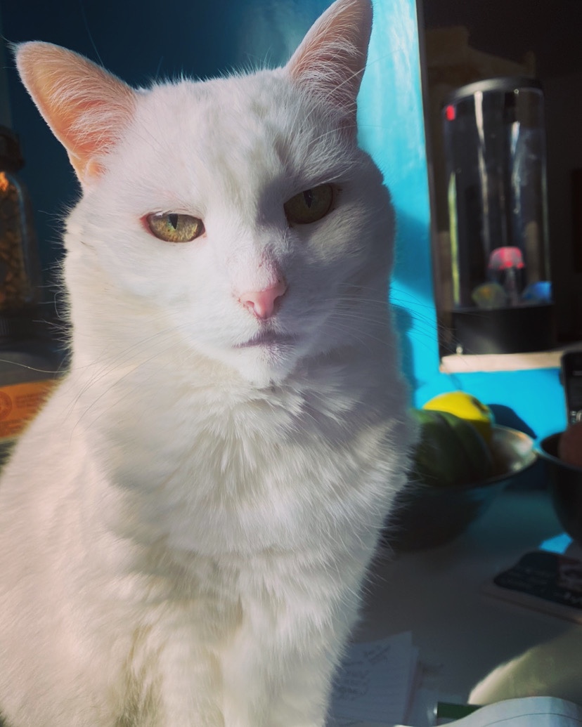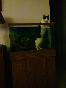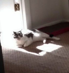 P.S. Noel still takes her meals in the herb window. She jumps on a low cabinet in the dining room, into the pass-through window from the dining room to the kitchen, then gets onto the kitchen table, and screams until she is picked up (see pic below) and placed on the kitchen counter so that she can get into her herb window. For those of you that think cats on the counters are disgusting; we wipe down all our counters/tables every day with antibacterial agents. If you can’t stand the idea of cats on your counters, then don’t allow it. Here at the zoo we protect ourselves and try to minimize the possibility of issues with clean sponges, antibacterial wipes, and healthy animals.