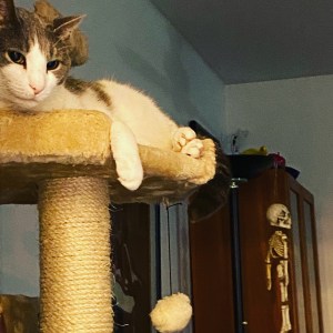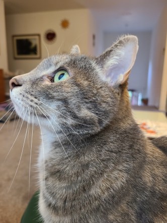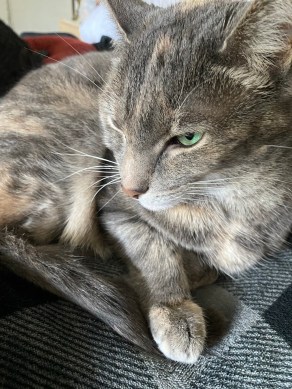 Noel does not like to sit on anyone’s lap. However, she wants my attention. And, she wants all my attention on her. So she gets on the table next to the recliner and she paws at me constantly. She meows at me and then paws some more. She did once actually jump on my lap for a second to wake me up because I was not paying enough attention. But, it was only for a second. She did not stay.