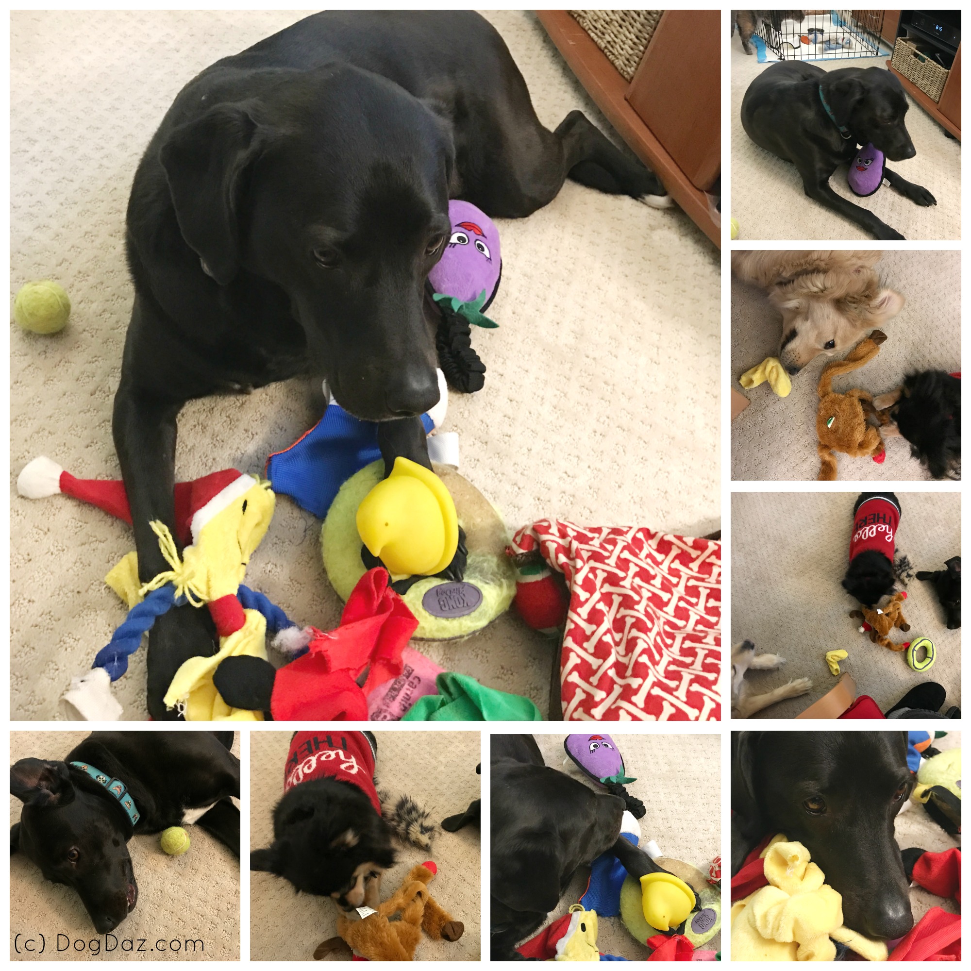Sofie is a different matter, as she has gotten older, and more anxious, she chases them away from her toys. They have learned that staying away from her is the best idea.