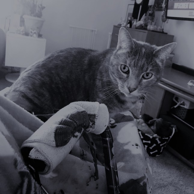 Mini Copper here. It has been so nice that Mom has not been able to move much over these last several weeks. She does have this silly walking stick she uses, but mostly she has been available for me to lie on her lap or her side. I really could get used to her being my endless source of snuggling. She does not seem so happy about it though because I do tend to want to stretch my very pointy claws into her legs every now and then. I think every cat needs a convalescing human to lay on, don’t you?