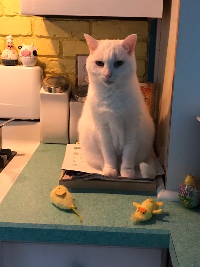 <Turn your sound on> In the morning, I feed the animals and then I go into my office. It never fails that almost every morning Queen Noel, who eats in her cat window in the kitchen, grabs one of her loveys and sings until I come back to the kitchen so she can present it to me. I assume it is her way of saying either, ‘thank you for the meal’ or ‘feed me more, servant!’.