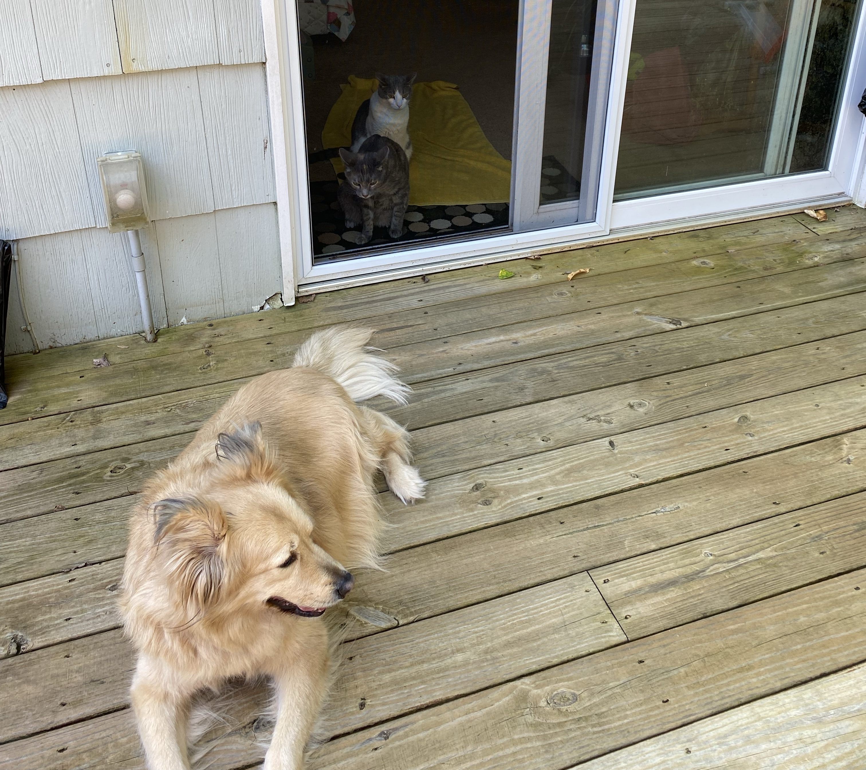 We have reached the DogDaz of Summer. Those hot hot Mid-Atlantic August, thunderstorms every day, days. The dogs don’t mind so much. (Which is wonderful because Sofie and ultimately Louise, were terrified of the T-storms). They wander around the yard, which for the littles is a ton of space, and stay in the shade. Charlie mostly does his thing and after 10 minutes wants to go inside to the A/C. Jolie is still discovering that there is a wonderful world outside of a cage (after 6 1/2 yrs), so she never wants to go inside no matter how hot it is.