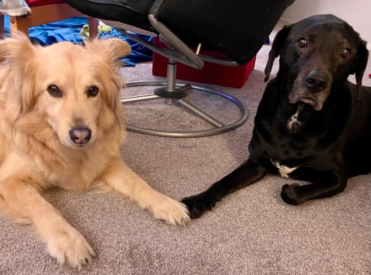 Sometimes I wonder if Louise and Sofie are a bonded pair. Louise was 1 when puppy Sofie came to live with us. They have been together almost their whole lives (they are now 6 and 7). They do not function well when the other is not near by. They work together as a team, especially when it comes to squirrels. They get mopey if the other is not around. Though they are not always next to each other, or even in the same room (for example: Louise sleeps in her kennel downstairs and Sofie on her dog bed upstairs), they don’t like if the other is not in the house. Charles is new to the pack, so they really don’t care much about him, and may never, but clearly, they get confused if the other is not in the picture.