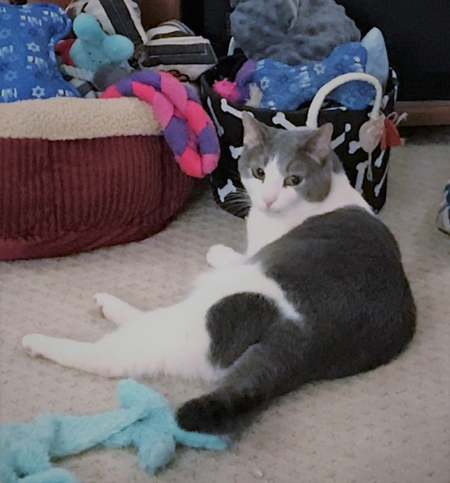 It amazes me that the cats like to sit in the middle of all the dog toys, and then, one of them goes into the toy basket and finds a tiny catnip toy all the way on the bottom of the basket and brings it out to play with. How does Nine do that?