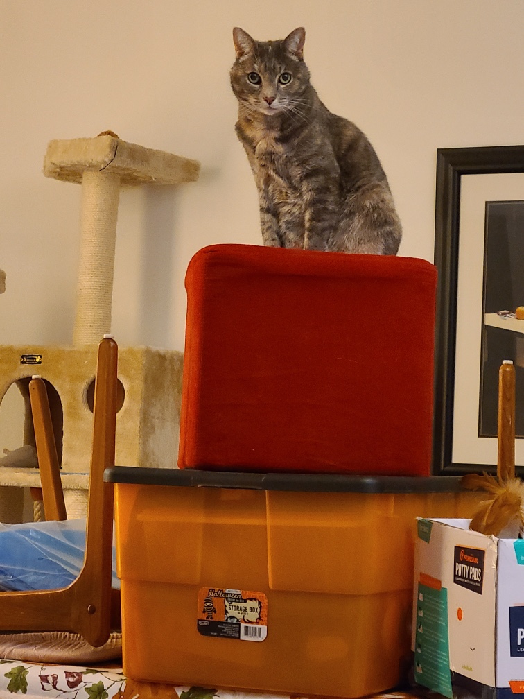 Luckily, she didn’t come crashing down and bring the fan and all the boxes with her.