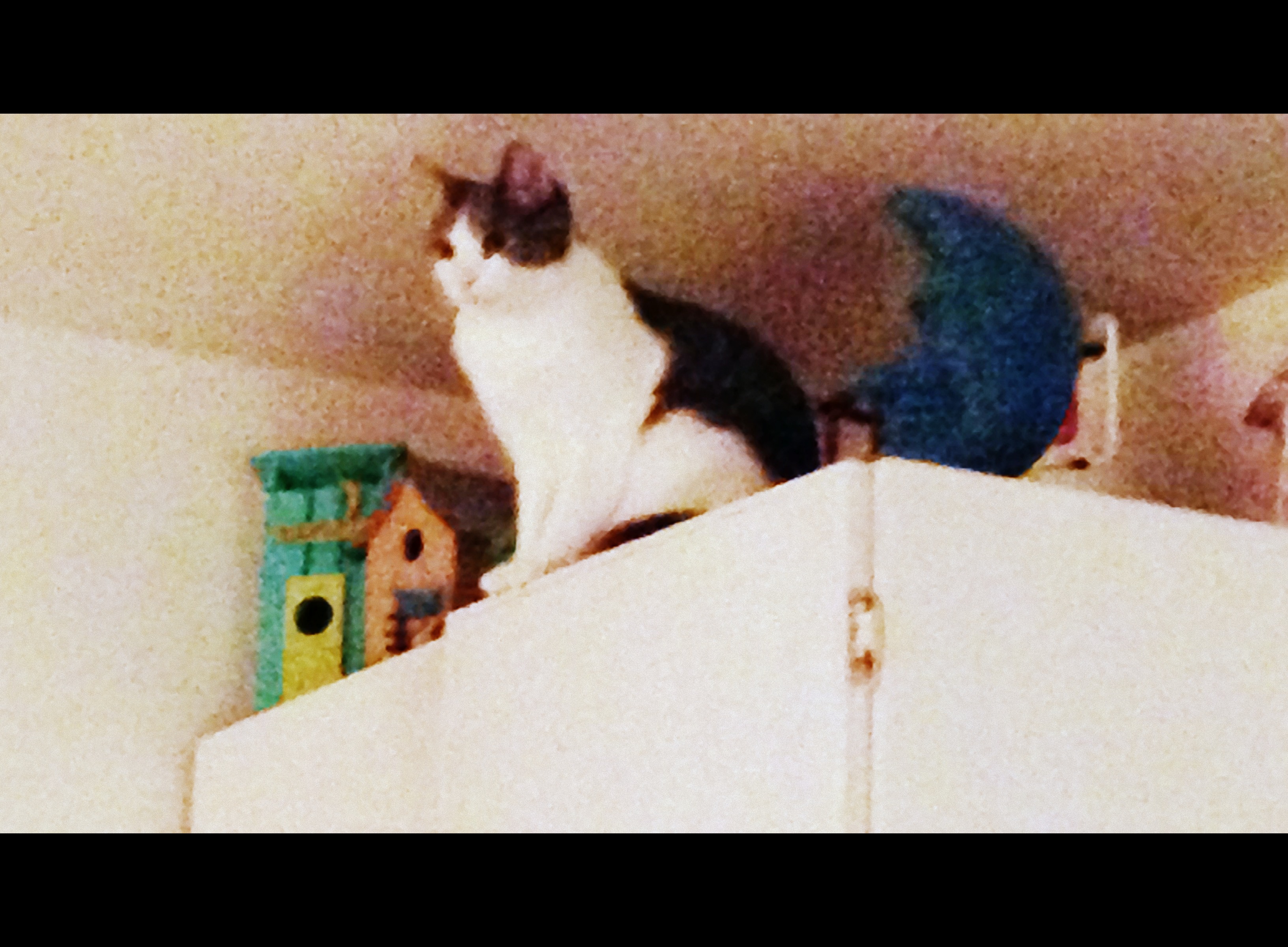 I took this picture of Nine on top of the bedroom closet late at night trying to get some flying bug. He jumped from the top, about 7 feet high, on to the bed 4 feet away. Scare the heck out of me. The humans got the bug.