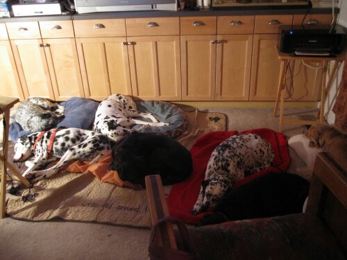 That is Louise in the middle of the dalmatian pack. The back row is Oreo, Millie & Jolene. In front of Jolene is another black dog, Spunky and Sofie is under the chair on the right.