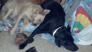 We are tired of waiting and she always seems to leave us behind. Someday we want to go with her. We promise that we will be good, We won’t throw up in the car, or bark at every thing that passes, or try to get in the front seat, or any of that. Well, I can’t speak for Sofie. She doesn’t do well riding in the car. Sofie turns kind of green if she can’t see out the front window all the time. Mommy tries to make her lie down but she doesn’t like to listen. Sofie tries stepping in between the front seats, which is a big ‘No – No!’ I don’t know how to tell her if she just laid down and closed her eyes she would be ok. I don’t like the car very much either, except I get to be close to Mommy and that I like. And if I stay behind the front seat, I get cookies! I love cookies. Maybe that is Sofie’s problem, because she does not like cookies very much. She spits most of them out and gives them to me. The only cookies she seems to like are the little one’s with molasses in them or the real chicken pieces that Mommy makes. It is not natural, a dog that doesn’t like cookies. Maybe Sofie is really a fox or something. She does smell funny at times. I do hope that Mommy comes back tomorrow like she said she would. V is going to leave us at the Dogcare place overnight tonight because K8 has to go back to college too, and we have never ever ever slept at a kennel before. I hope that they keep Sofie with me, ’cause she gets scared and needs me to protect her. When Mommy gets home this time I am going to make sure she never goes away again… (I have a plan for Sofie and Nine to eat a hole in her suitcase (don’t tell her please.)) – Lulu Belle