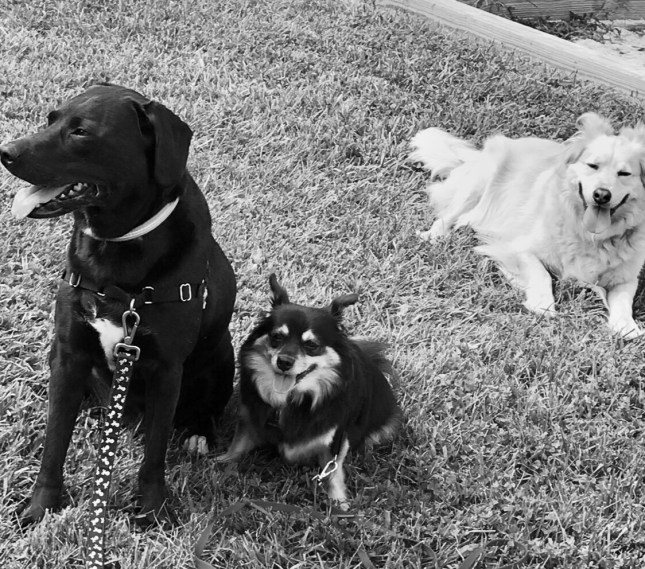 The trio in black and white. It’s not easy getting all three of them in a single shot and definitely not when they are all smiling. I love these three goofballs. When you have animals that all have significantly different personalities, a nice long walk helps them calm together. What makes you smile? A walk, a tummy rub, bacon???