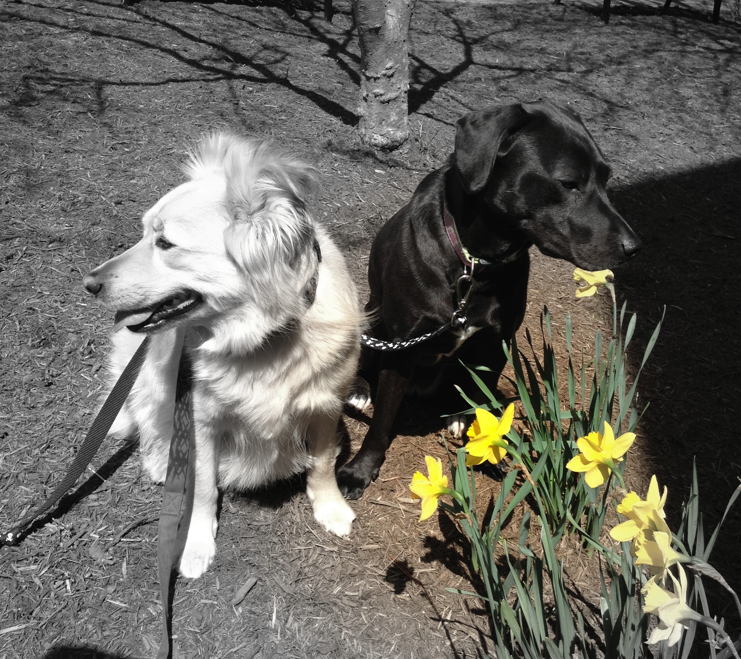 Year after year the spring flowers around the neighborhood start to pop-up in April. It is a wonderful time to walk around and see spring in action. But, Mom is not allowed to walk dogs yet so she is going back through some memory photos to enjoy her time with us in the sunshine. Soon she says, very soon she is hoping that she will get the OK to saddle up and walk 140 lbs of dog weight. We promise we won’t pull you down Mom, unless we see a squirrel, or another dog, or a fox, or….. oh, I guess that is why you are only allowed to walk 17 lb Charles.