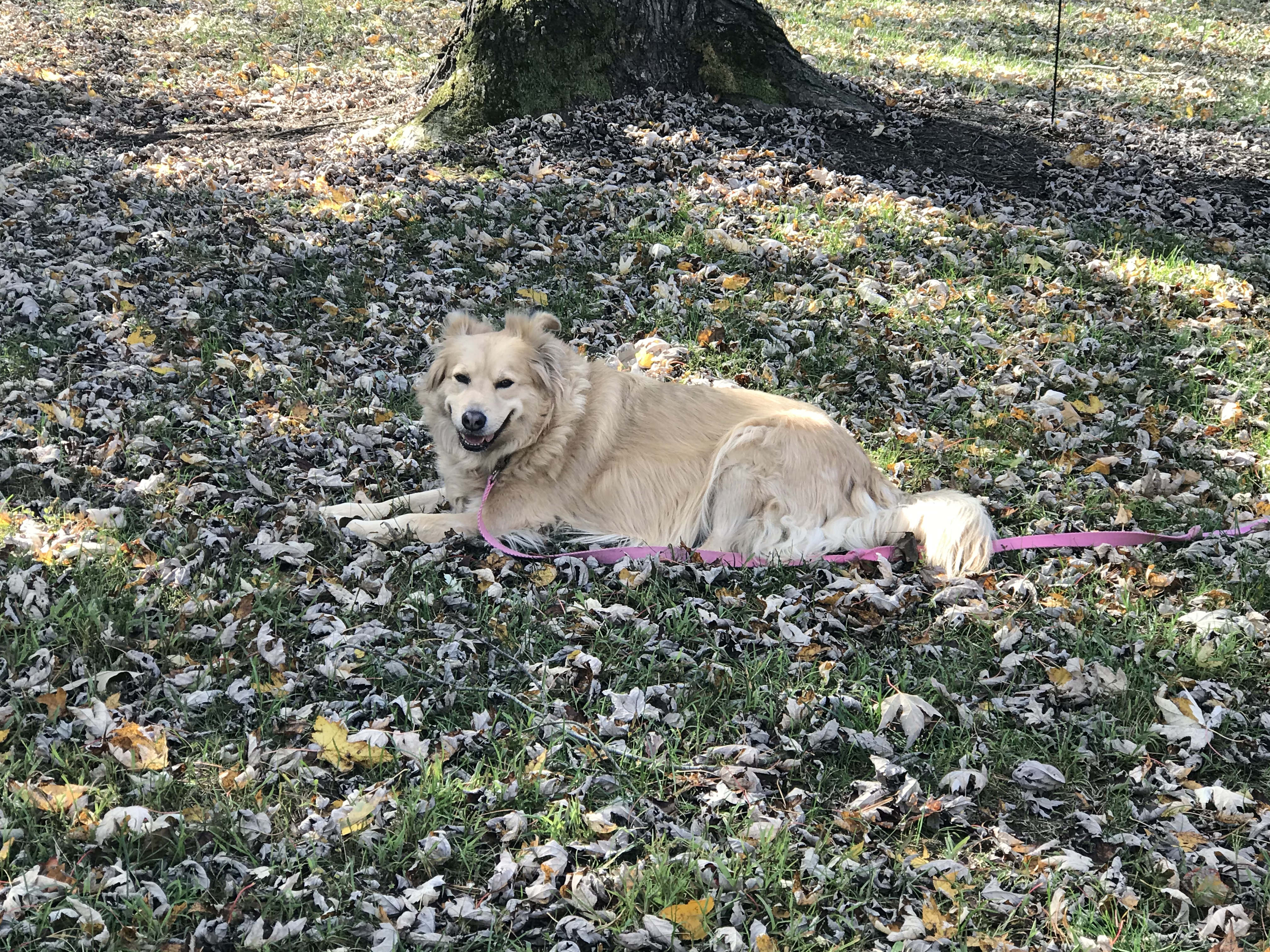 “Why are you making me sit here in front of the roses, Mom? Grump, grump, grump. Let’s just keep walking.”(Don’t my wild roses look great for late fall? They really had a second burst.) I just love this dog.