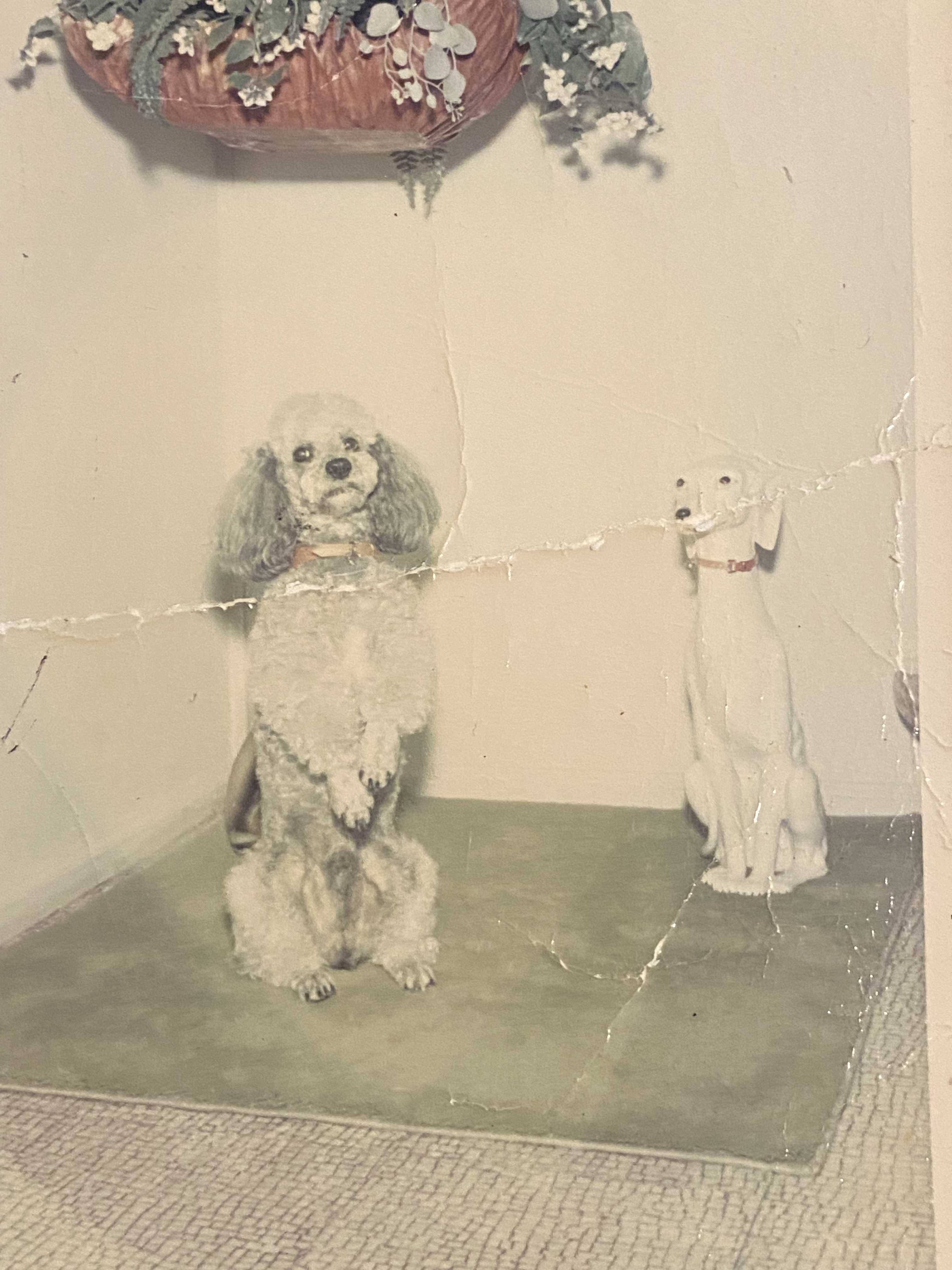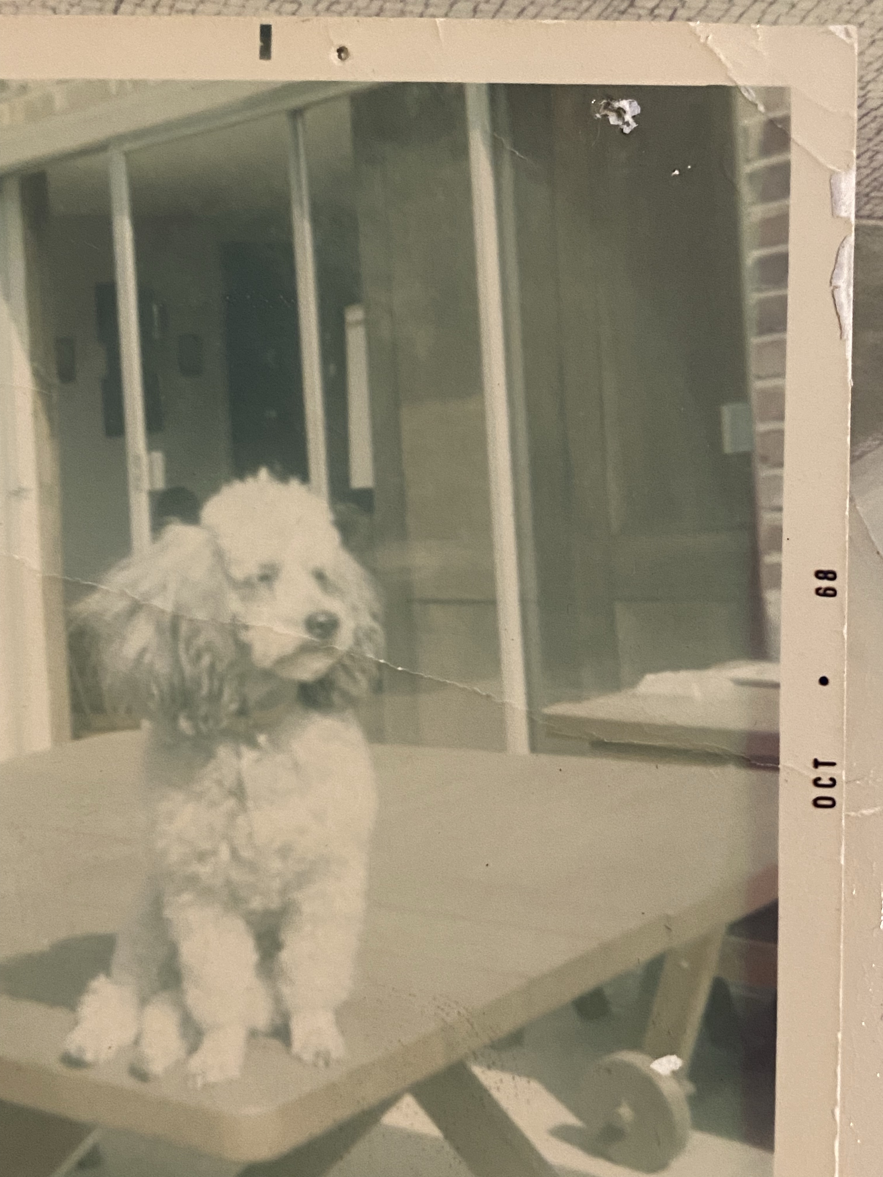 I was visiting my sister last week and she had all these pictures of him from the ’60s. I think the story was that a friend of my sister’s owned a pizza parlor and they had this French poodle that they did not want. Our dog, Freya had just passed away (she got hit by a car), so these people gave Louie to us. Whether any of that is true (except the losing Freya part which I was there for), I do not know. I was maybe 5 or 6 years old.