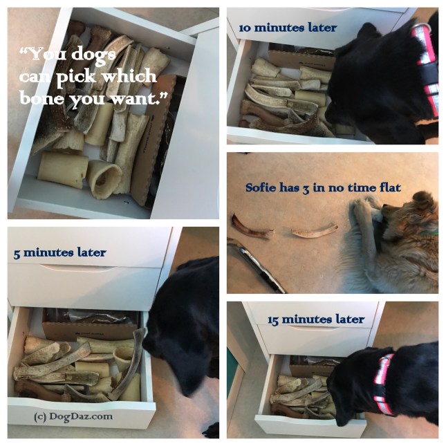 Some dogs (Sofie) don’t waste any time when given the opportunity to select a bone. Other dogs (Louise) take their time to pick just the right one. In the end, Louise waits until Sofie finishes whatever one she is chewing and takes that one. Does it taste better? Bark Out Loud. I just love these goofballs.