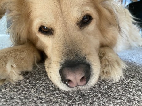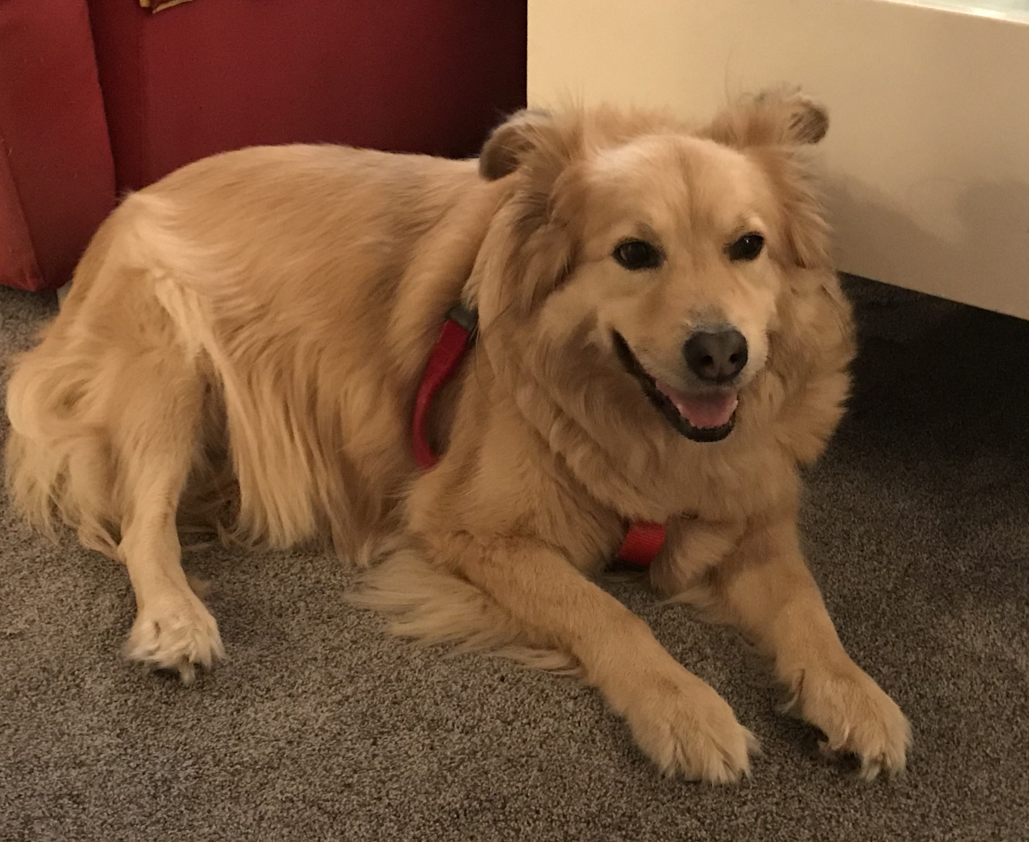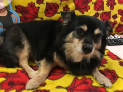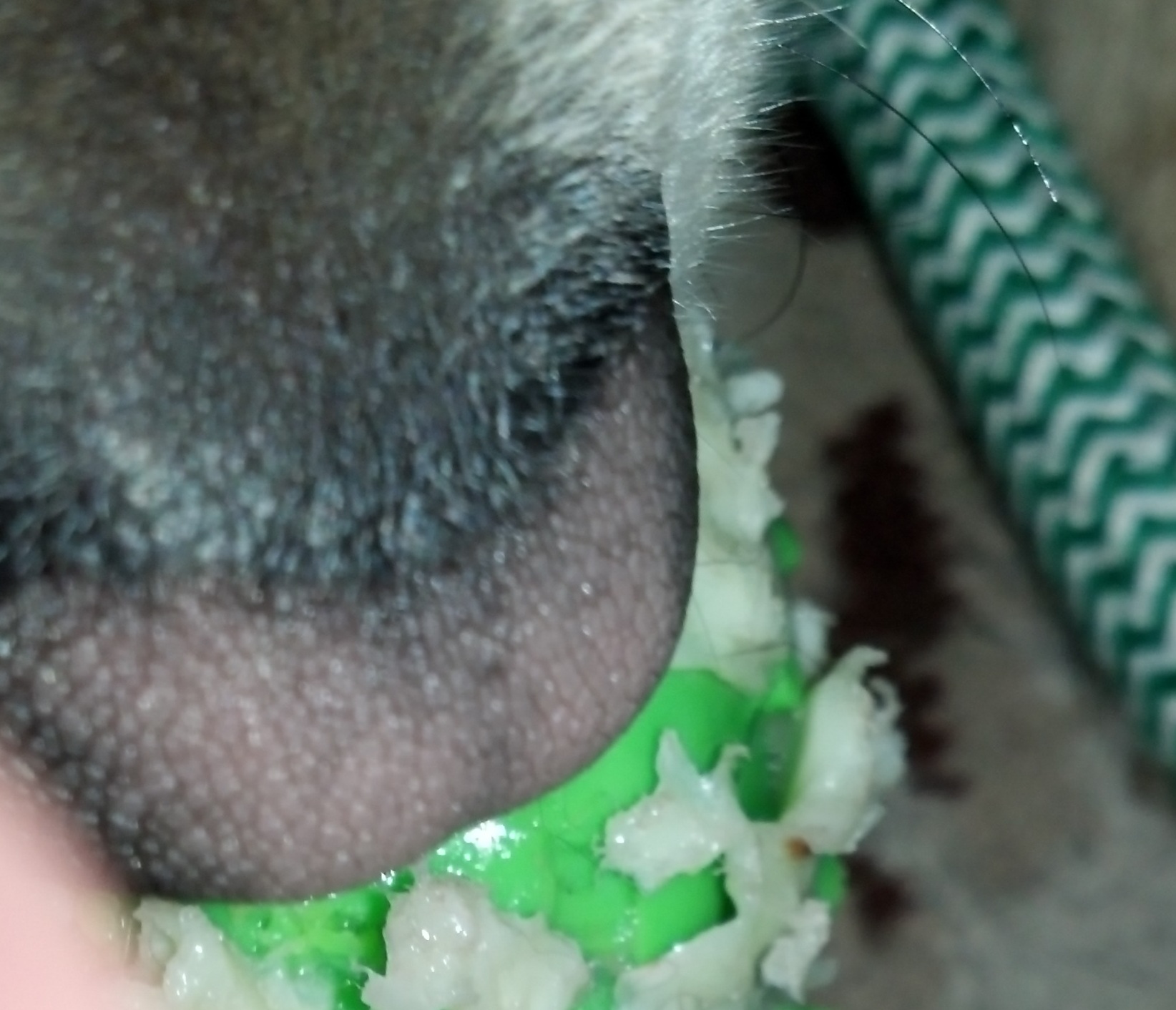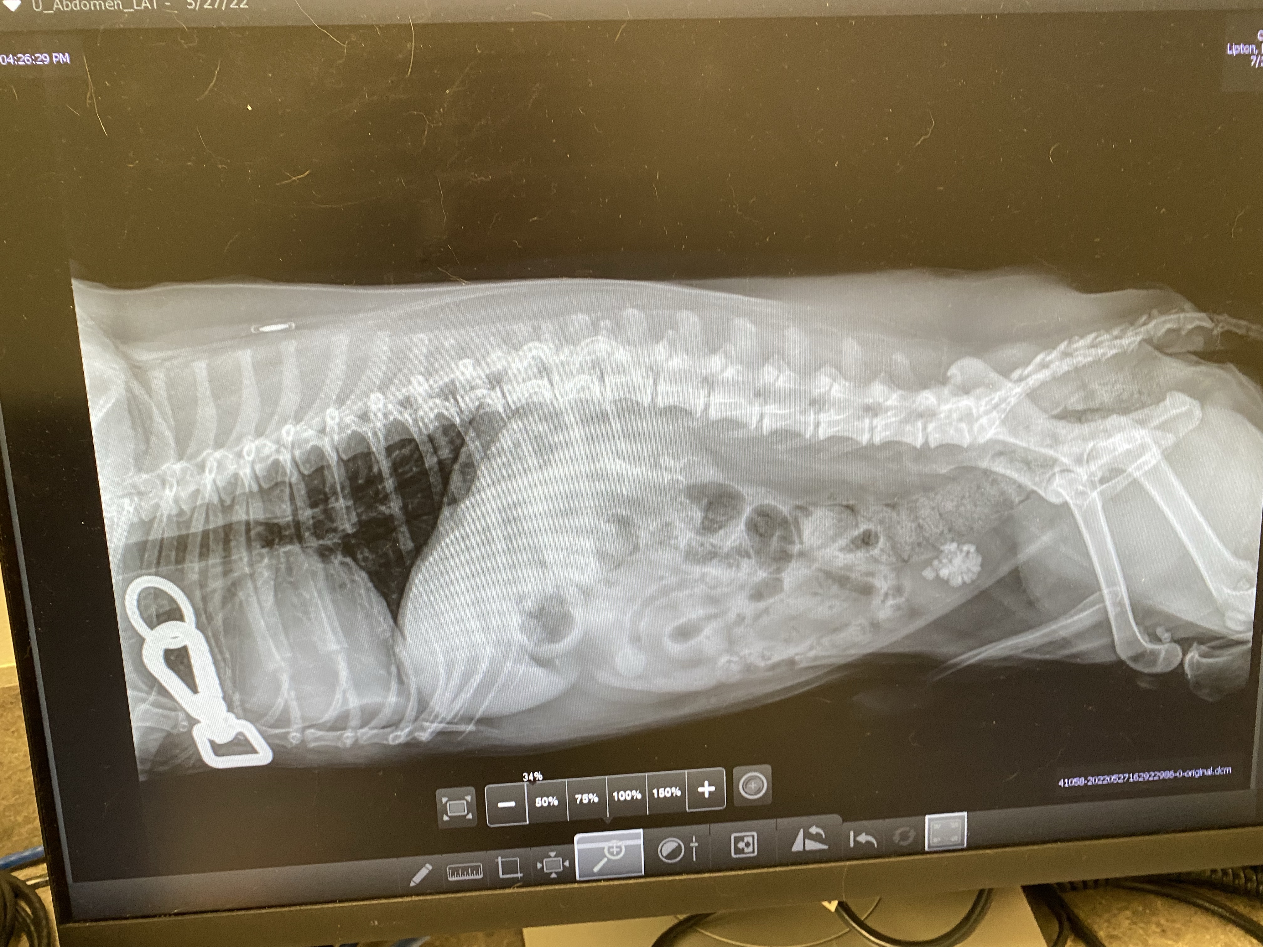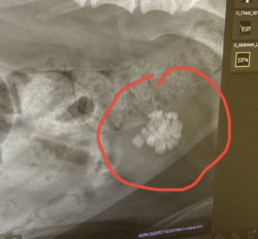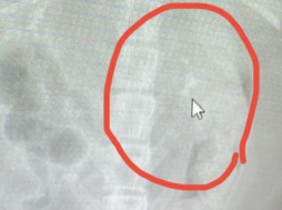Second – When they took the heart x-ray she notice that he has KIDNEY STONES (arrow above but see closer image below). This was an ‘incidental finding’ since she was actually x-raying his heart. According to pethealthnetwork.com, metabolic kidney stones, those that form due to some blood or urinary imbalance, are a bit more common than those from infection. The most common type is calcium oxalate. There are several different types of stones (we are learning). Stones tend to be a small dog thing but usually females. We are hoping they are not calcium oxalate but actually something called Struvite. That is a composite of magnesium, ammonium, and phosphate and can be dissolved, where the calcium oxalate can’t.