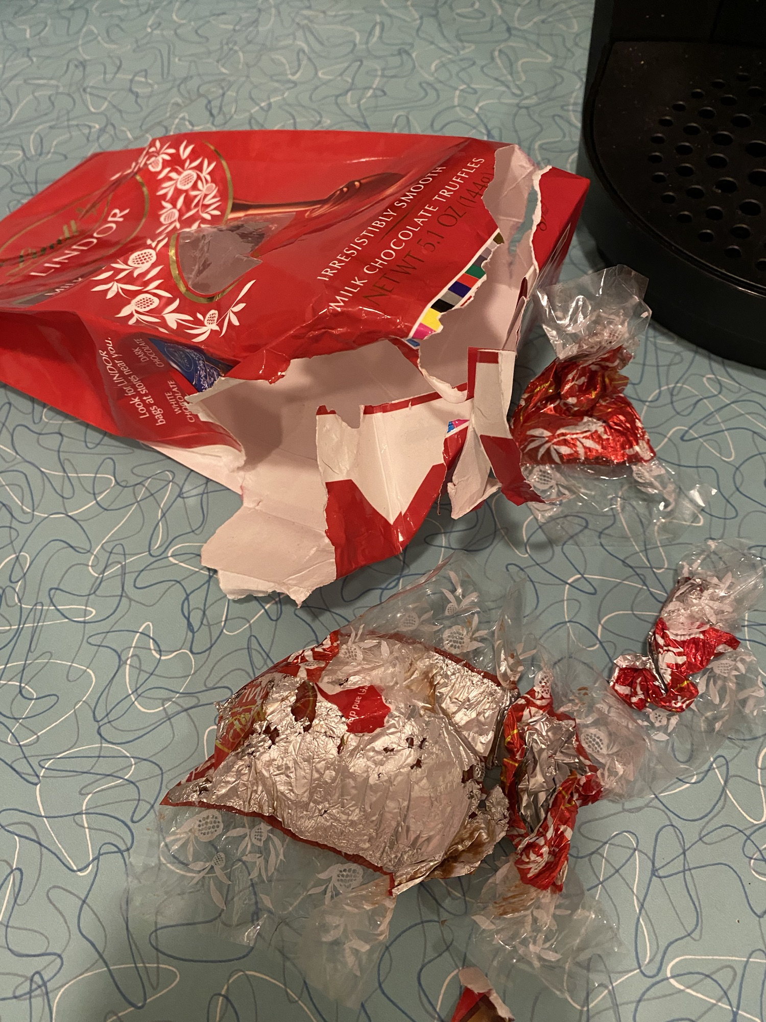 I wasn’t done yet, however. Even though Mom had holiday presents hidden in her office for months, now that I had the smell of yummy deadly chocolate on my mind, I went into a cardboard bag, in a plastic bag, in a cardboard box of presents in her office, and I ate 4 milk chocolate balls a few hours later. Mom didn’t even realize that I had that great a nose. I had not bothered any of her gifts that she had been hiding, so it didn’t even enter her mind that I would rip open a closed package. I went downstairs and pooped in the same place Mom had just shampooed from my earlier exploit. Wasn’t that nice of me?