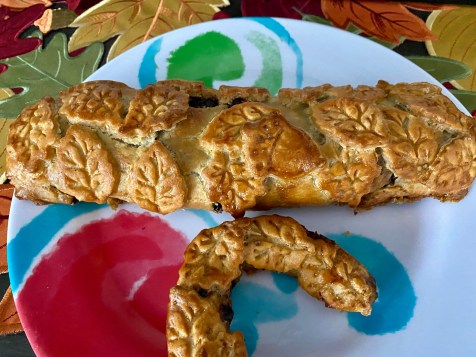 But wait! Mom put a box of Christmas presents under the window so that she could wrap them on the dining room table. It was a low box, so she figured it was safe. Oh, did I tell you Mom loves to bake (LoriansKitchen.com). She had made this awesome gluten and dairy-free chocolate walnut strudel with amazing little leaves and acorns on it. Yep, you got it. I am really smart. Mom was cooling her treat on the kitchen table and I managed to help myself to all her beautiful handy work. (Before and after pictures below)