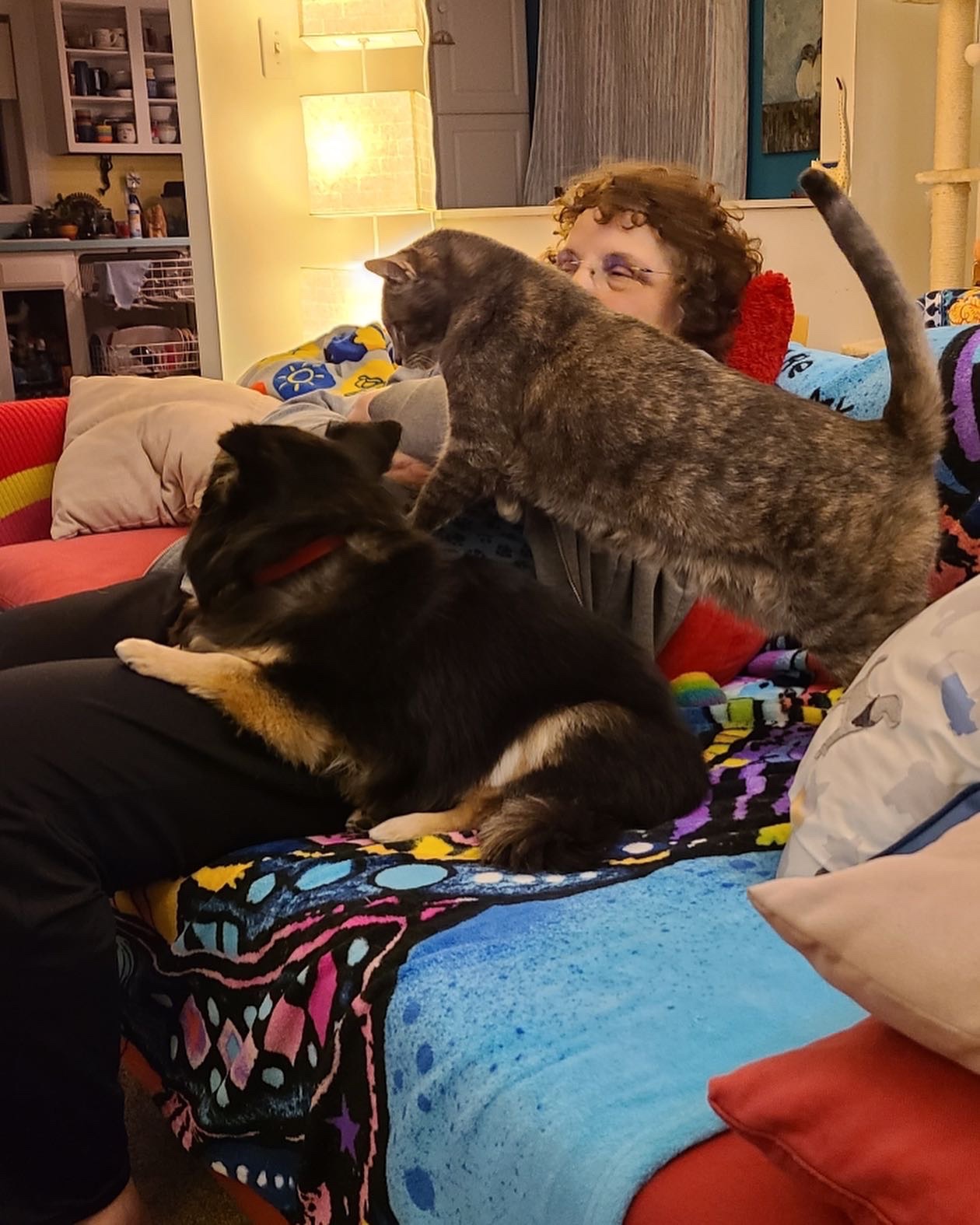 So I made a similar pillow mountain on the other side of the couch for Jolie. What does Mini do? Go over to that side and sit right on Jojo.