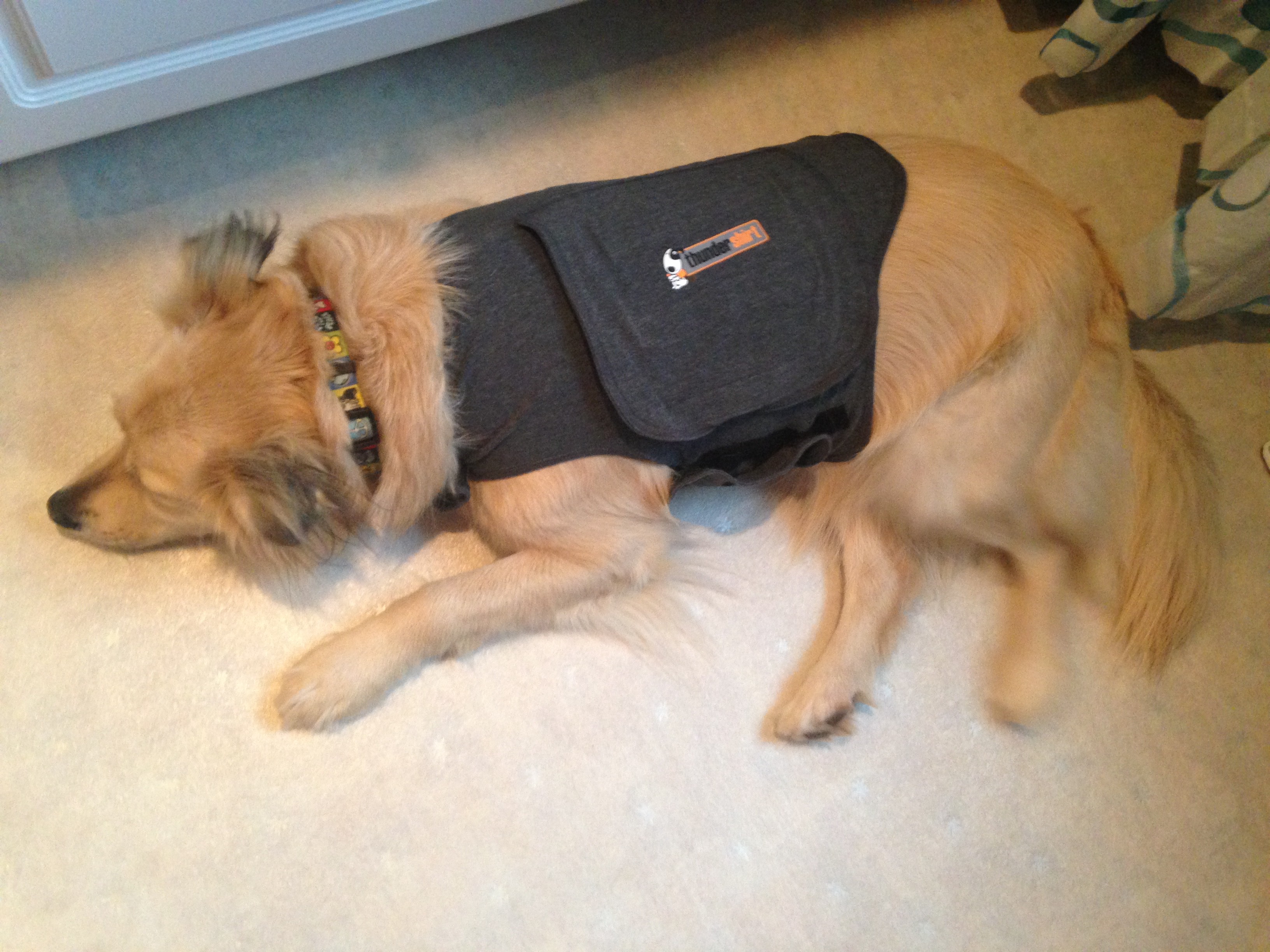 Mommy thinks that this stretchy shirt thingy will make me feel less crazy when the big boomers start outside the window. She says that there are elves in the sky rolling balls into pins and when they hit them it makes those big smashing sounds. I am not sure that I believe her but the shirt does make me kind of sleepy. I really only feel better when I am lying on Mommy’s feet and, of course, when they stop making all that racket.